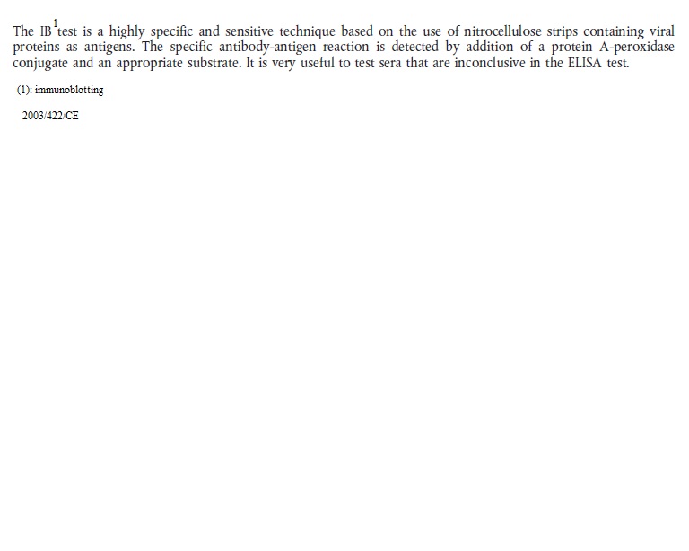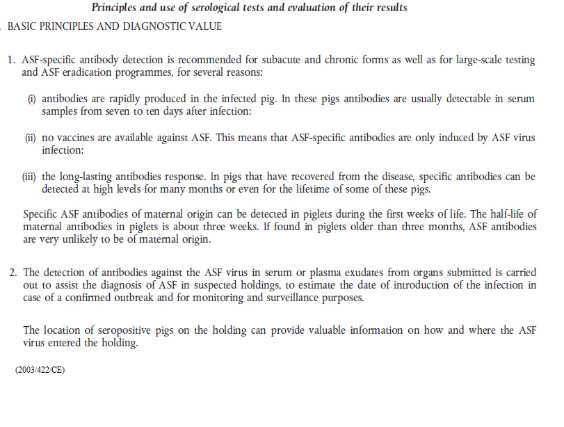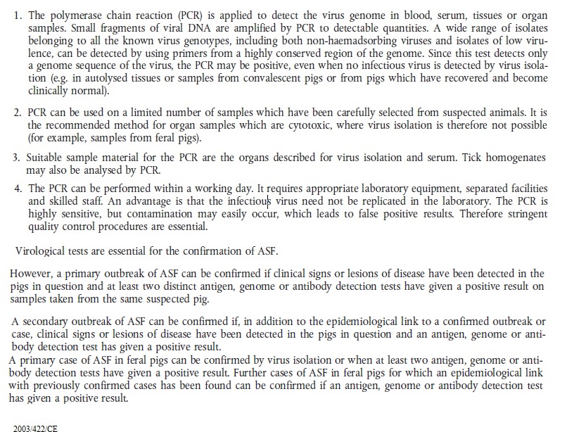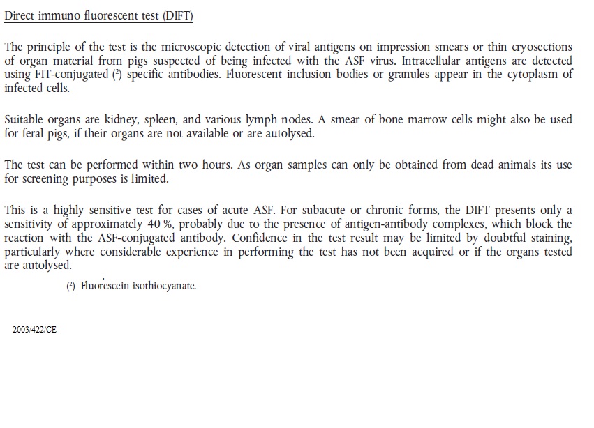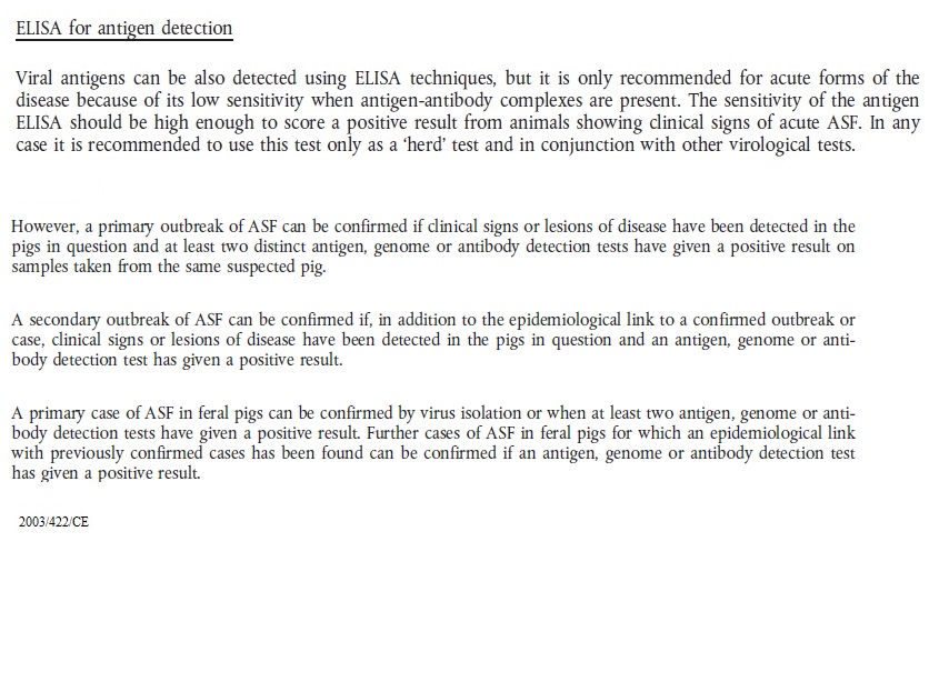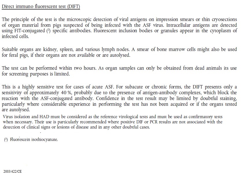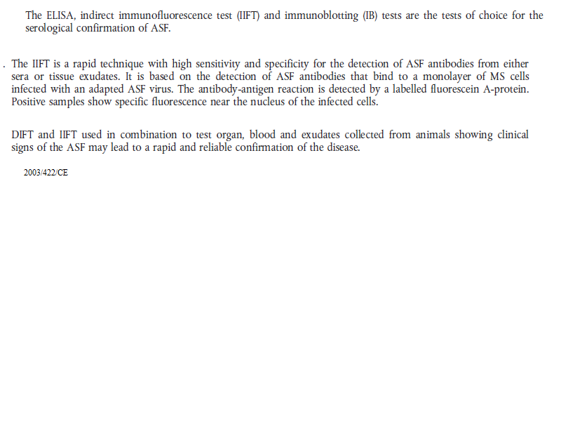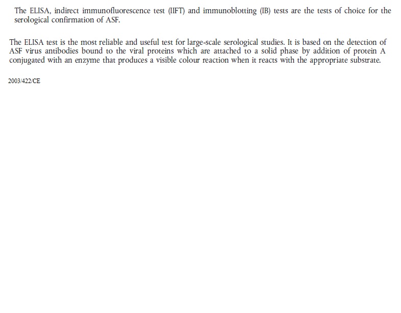 2003 422.url 2003 422 ASF Antigen ELISA.jpg 2003 422 ASF ELISA.jpg 2003 422 ASF Immunoblotting.jpg 2003 422 ASF immunofluorescence.jpg 2003 422 ASF Indirect immunofluorescence test.png 2003 422 ASF Serological tests and evaluation of their results.jpg 2003 422 ASF Virus isolation and haemadsorption test.jpg 2003 422 ASV PCR.jpg 2003 422 sentinel repopulation.txt african_swine_fever.pdf ASF 2003 422 CE.url ASF Legislation prescribed assays.cmap Dec 2003 422 ASF.url Dir 2002 60 ASF.url Epitools ASF Surveillance.txt Epi tools ASF Total repopulation.txt OIE ASF 2002 60.url OIE - ASF Definition freedom.url OIE ASF dir 2002 60.url OIE ASF international trade.url OIE ASF Manual.url OIE ASF Recommandations for importations.url OIE Manual CSF.url Re 282 2004.url Suspicion 2003 422.url