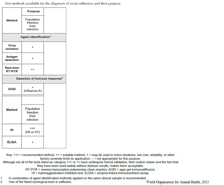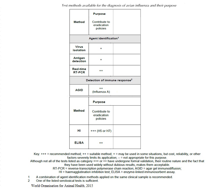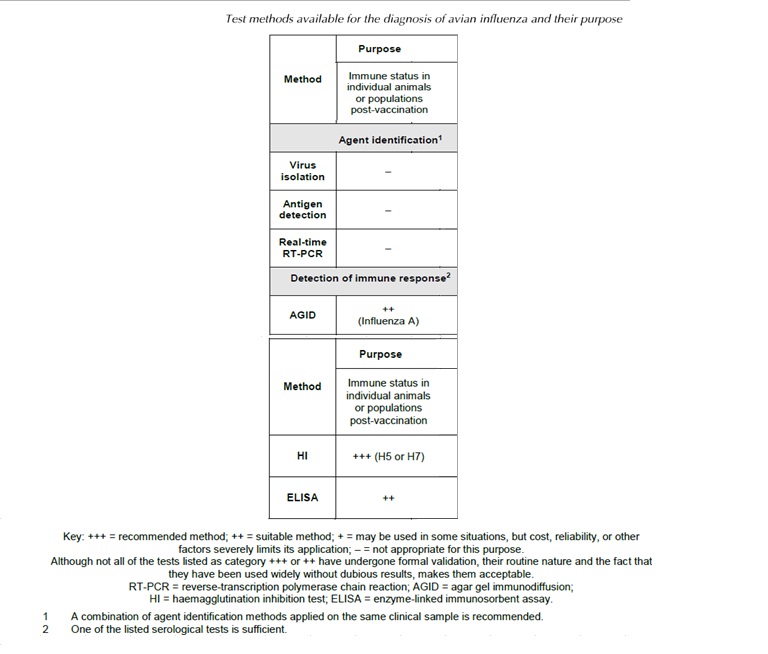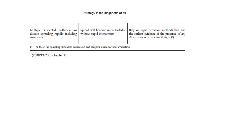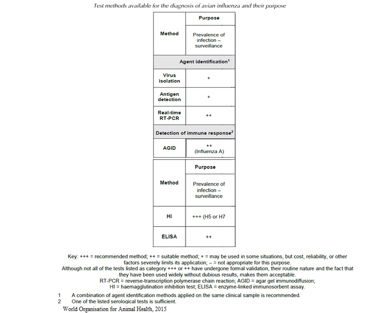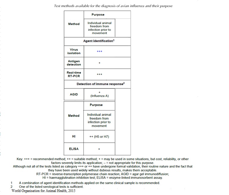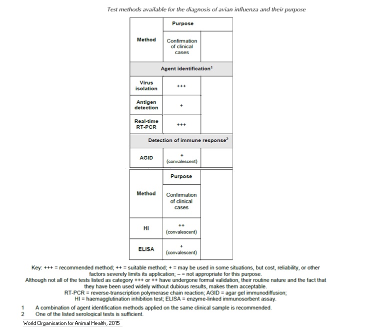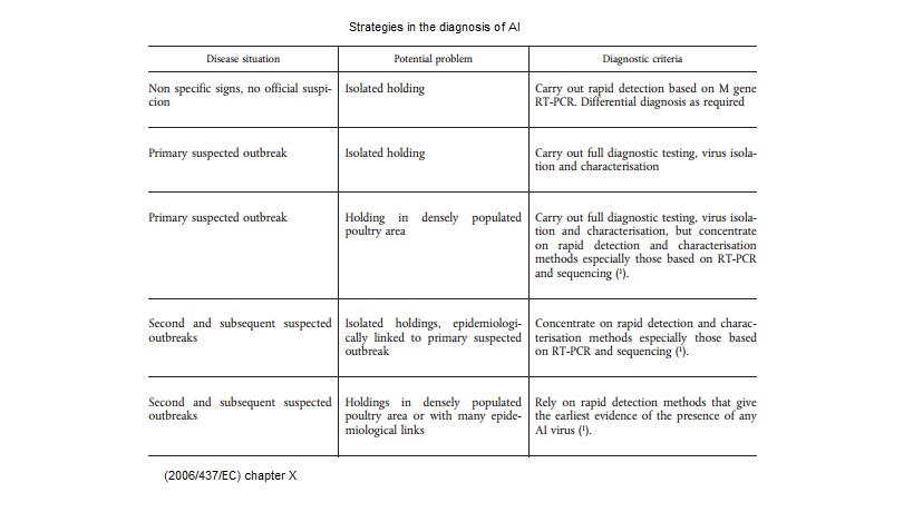 2006 437 Shematic overview of diagnostic steps for confirmation of AI.jpg 2006 437- Strategies in the diagnostic of AI-spread.jpg 2006 473- Strategies in the diagnostic of AI- suspicion.jpg 2010 367- Number of duck, goose, mallard holdings to be sampled.jpg 2010 367- Number of poultry holdings to be sampled in each poultry category.jpg Avian Influenza.pdf chapitre_avian_influenza_viruses.pdf OIE AIV.url OIE-AIV confirmation of clinical cases.jpg OIE-AIV contribute to eradication.jpg OIE-AIV freedom from infection prior to movement.jpg OIE-AIV Immune status post vaccination.jpg OIE AIV Manual.url OIE-AIV population freedom from infection.jpg OIE-AIV serosurveillance.jpg OIE-AIV surveillance.jpg OIE freedom.url OIE-importations.url OIE Manual.url OIE surveillance.url OIE-virological surveillance.jpg