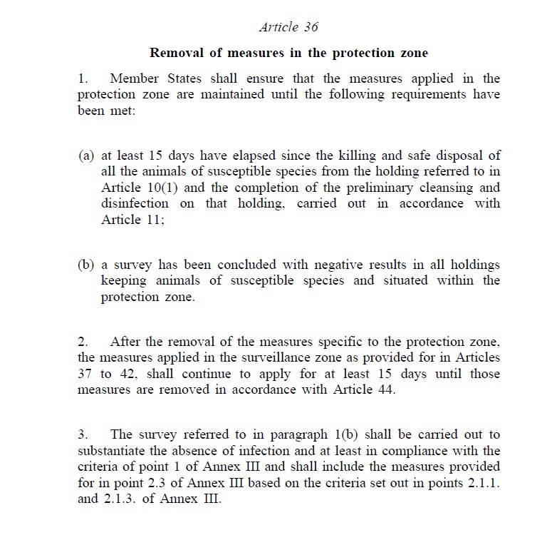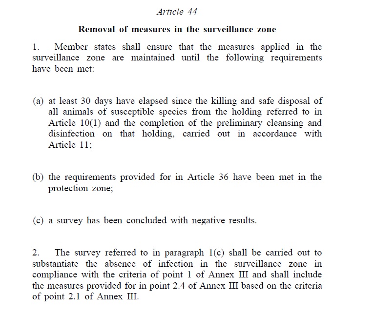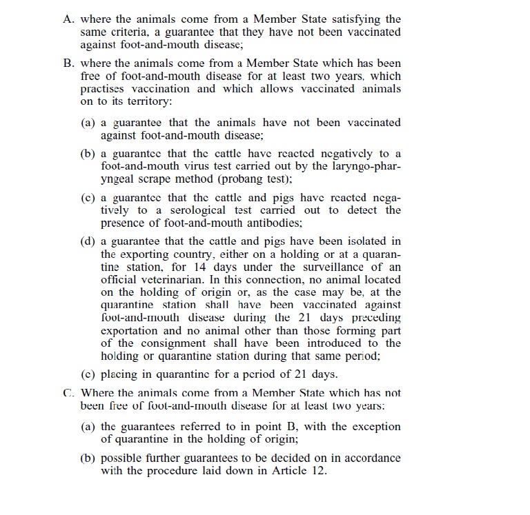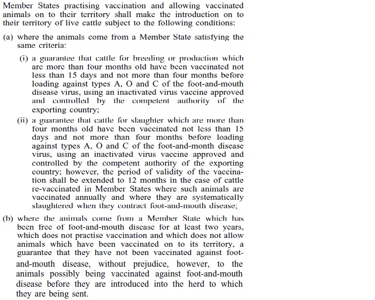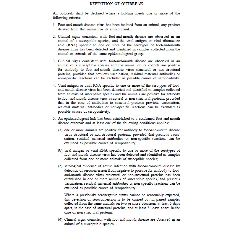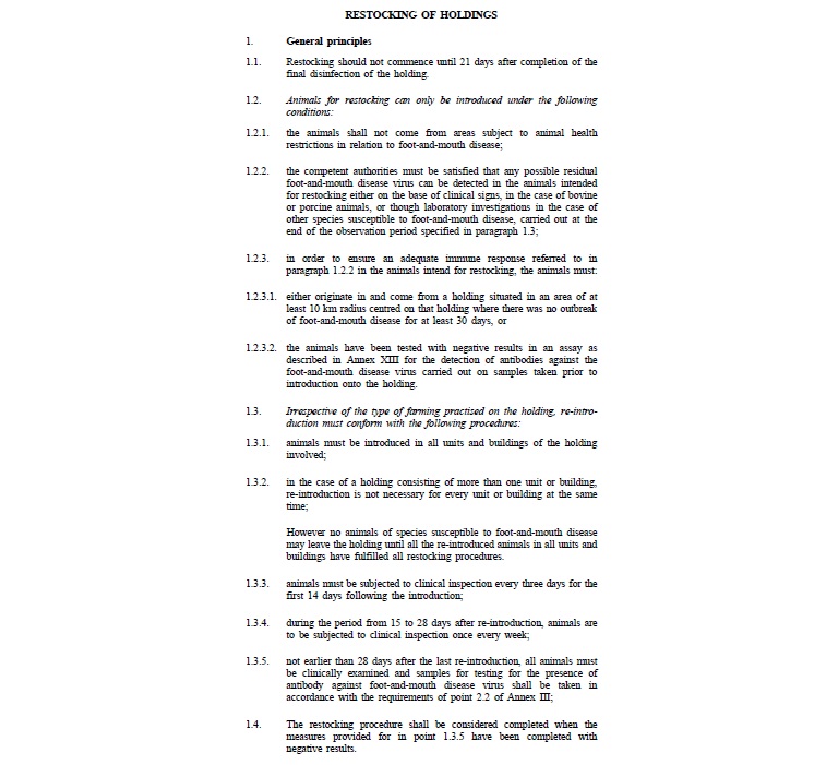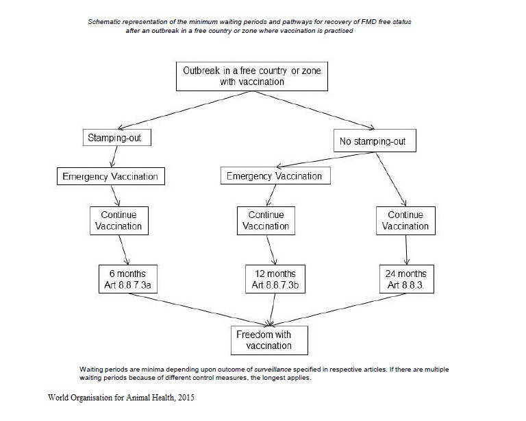 2003 35 FMD Removal of measures in the protection zone.jpg 2003 85.url 2003 85 FMD.url 2003 85 FMD Definition of outbreak.jpg 2003 85 FMD Removal of measures in the surveillance zone.jpg 2003 85 FMD Repopulation.jpg 84 643 FMD States practising vaccination.jpg Dir 84 643.url Dir 84 643 States indemne and no vaccination.jpg EuFMD.url FMD Sample size suspicion without clinical sign.txt FOOT_AND_MOUTH_DISEASE.pdf OIE definition freedom.url OIE FMD Manual.url OIE - FMD Minimum waiting periods and pathways for recovery of FMD free status.jpg OIE FMD min waiting eriod and pathways for recovering free status.jpg OIE - FMD Schematic representation of laboratory tests for determining evidence of infection.jpg OIE - FMD Waiting periods and pathways for recovery of FMD free status.jpg OIE recommandations for importations.url OIE surveillance.url