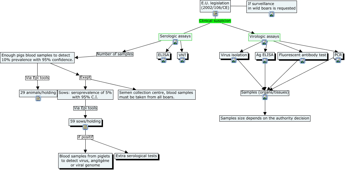 This Concept Map, created with IHMC CmapTools, has information related to: CSF Legislation prescribed assays, Virologic assays ???? Virus isolation, E.U. legislation (2002/106/CE) Clinical suspicion Serologic assays, Serologic assays Number of samples Enough pigs blood samples to detect 10% prevalence with 95% confidence., 59 sows/holding if positif Blood samples from piglets to detect virus, angitgène or viral genome, E.U. legislation (2002/106/CE) Clinical suspicion Virologic assays, PCR Samples (organs/tissues) Samples size depends on the authority decision, Sows: seroprevalence of 5% with 95% C.I. Via Epi tools 59 sows/holding, E.U. legislation (2002/106/CE) If surveillance in wild boars is requested, Serologic assays ???? VNT, Serologic assays ???? ELISA, Virologic assays ???? PCR, 59 sows/holding if positif Extra serological tests, Virologic assays ???? Fluorescent antibody test, Enough pigs blood samples to detect 10% prevalence with 95% confidence. Via Epi tools 29 animals/holding, Virologic assays ???? Ag ELISA, Fluorescent antibody test Samples (organs/tissues) Samples size depends on the authority decision, Enough pigs blood samples to detect 10% prevalence with 95% confidence. Exept Semen collection centre, blood samples must be taken from all boars., Enough pigs blood samples to detect 10% prevalence with 95% confidence. Exept Sows: seroprevalence of 5% with 95% C.I., Virus isolation Samples (organs/tissues) Samples size depends on the authority decision, Ag ELISA Samples (organs/tissues) Samples size depends on the authority decision