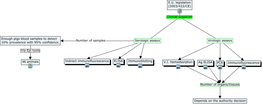 This Concept Map, created with IHMC CmapTools, has information related to: ASF Legislation prescribed assays, V.I. hemadsorption Number of organs/tissues Depends on the authority decision, Serologic assays ???? Immunoblotting, Virologic assays ???? V.I. hemadsorption, Serologic assays Number of samples Enough pigs blood samples to detect 10% prevalence with 95% confidence., Serologic assays ???? ELISA, Serologic assays ???? Indirect immunofluorescence, Enough pigs blood samples to detect 10% prevalence with 95% confidence. Via Epi tools 46 animals, PCR Number of organs/tissues Depends on the authority decision, Immunofluorescence Number of organs/tissues Depends on the authority decision, Virologic assays ???? PCR, E.U. legislation (2003/422/CE) Clinical suspicion Serologic assays, Ag ELISA Number of organs/tissues Depends on the authority decision, Virologic assays ???? Immunofluorescence, E.U. legislation (2003/422/CE) Clinical suspicion Virologic assays