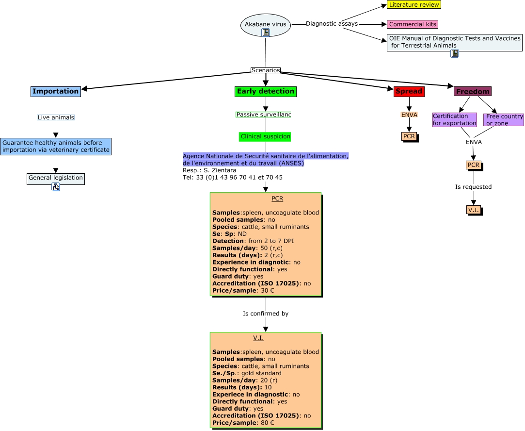 This Concept Map, created with IHMC CmapTools, has information related to: Akabane, Freedom Free country or zone ENVA, Freedom Certification for exportation ENVA, ENVA ???? PCR, Importation Live animals Guarantee healthy animals before importation via veterinary certificate, PCR Is requested V.I., Clinical suspicion Agence Nationale de Securité sanitaire de l'alimentation, de l'environnement et du travail (ANSES) Resp.: S. Zientara Tel: 33 (0)1 43 96 70 41 et 70 45 PCR Samples:spleen, uncoagulate blood Pooled samples: no Species: cattle, small ruminants Se: Sp: ND Detection: from 2 to 7 DPI Samples/day: 50 (r,c) Results (days): 2 (r,c) Experience in diagnotic: no Directly functional: yes Guard duty: yes Accreditation (ISO 17025): no Price/sample: 30 €, Akabane virus Scenarios Early detection, Spread ENVA PCR, Akabane virus Diagnostic assays Literature review, PCR Samples:spleen, uncoagulate blood Pooled samples: no Species: cattle, small ruminants Se: Sp: ND Detection: from 2 to 7 DPI Samples/day: 50 (r,c) Results (days): 2 (r,c) Experience in diagnotic: no Directly functional: yes Guard duty: yes Accreditation (ISO 17025): no Price/sample: 30 € Is confirmed by V.I. Samples:spleen, uncoagulate blood Pooled samples: no Species: cattle, small ruminants Se./Sp.: gold standard Samples/day: 20 (r) Results (days): 10 Experiece in diagnostic: no Directly functional: yes Guard duty: yes Accreditation (ISO 17025): no Price/sample: 80 €, Early detection Passive surveillance Clinical suspicion, Akabane virus Diagnostic assays Commercial kits, Akabane virus Scenarios Spread, Akabane virus Scenarios Freedom, Akabane virus Scenarios Importation, Akabane virus Diagnostic assays OIE Manual of Diagnostic Tests and Vaccines for Terrestrial Animals, Guarantee healthy animals before importation via veterinary certificate ???? General legislation