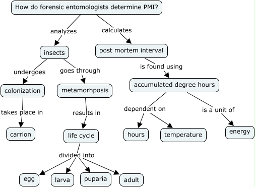 This Concept Map, created with IHMC CmapTools, has information related to: Entomologists, life cycle divided into egg, accumulated degree hours is a unit of energy, metamorhposis results in life cycle, colonization takes place in carrion, How do forensic entomologists determine PMI? analyzes insects, life cycle divided into larva, life cycle divided into puparia, accumulated degree hours dependent on temperature, insects goes through metamorhposis, life cycle divided into adult, How do forensic entomologists determine PMI? calculates post mortem interval, post mortem interval is found using accumulated degree hours, accumulated degree hours dependent on hours, insects undergoes colonization