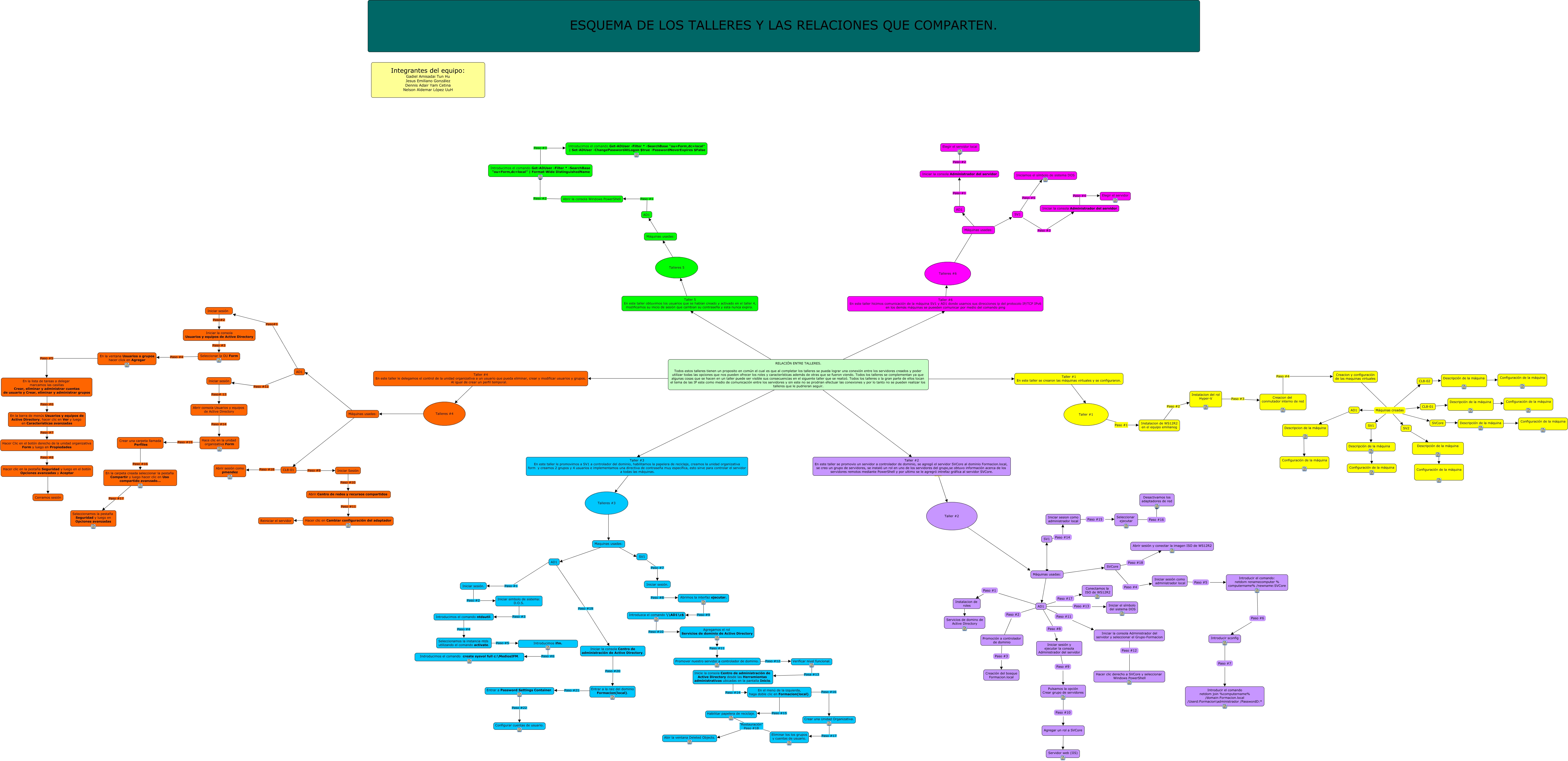 Este Cmap, tiene información relacionada con: Talleres_completos.cmap, Crear una Unidad Organizativa. Paso #17 Eliminar los los grupos y cuentas de usuario., Hacer clic en Cambiar configuración del adaptador ???? Reiniciar el servidor, AD1 Paso #13 Iniciar el símbolo del sistema DOS, Máquinas usadas: ???? SV1, Seleccionar ejecutar Paso #16 Desactivamos los adaptadores de red, Iniciar la consola Administrador del servidor Paso #4 Elegir el servidor, RELACIÓN ENTRE TALLERES. Todos estos talleres tienen un proposito en común el cual es que al completar los talleres se pueda lograr una conexión entre los servidores creados y poder utilizar todas las opciones que nos pueden ofrecer los roles y características además de otras que se fueron viendo. Todos los talleres se complementan ya que algunas cosas que se hacen en un taller puede ser visible sus consecuencias en el siguente taller que se realizó. Todos los talleres o la gran parte de ellos tocan el tema de las IP este como medio de comunicación entre los servidores y sin este no se prodrian efectuar las conexiones y por lo tanto no se pueden realizar los talleres que le pudrieran seguir. ???? Taller #3 En este taller le promovimos a SV1 a controlador del dominio, habilitamos la papelera de reciclaje, creamos la unidad organizativa form y creamos 2 grupos y 4 usuarios e implementamos una directiva de contraseña muy específica, esto sirve para controlar el servidor a todas las máquinas., RELACIÓN ENTRE TALLERES. Todos estos talleres tienen un proposito en común el cual es que al completar los talleres se pueda lograr una conexión entre los servidores creados y poder utilizar todas las opciones que nos pueden ofrecer los roles y características además de otras que se fueron viendo. Todos los talleres se complementan ya que algunas cosas que se hacen en un taller puede ser visible sus consecuencias en el siguente taller que se realizó. Todos los talleres o la gran parte de ellos tocan el tema de las IP este como medio de comunicación entre los servidores y sin este no se prodrian efectuar las conexiones y por lo tanto no se pueden realizar los talleres que le pudrieran seguir. ???? Taller #4 En este taller le delegamos el control de la unidad organizativa a un usuario que pueda eliminar, crear y modificar usuarios y grupos. Al igual de crear un perfil temporal., Habilitar papelera de reciclaje. "Restauración" Paso #18 Abir la ventana Deleted Objects., Iniciar sesión. Paso #8 Abrimos la interfaz ejecutar., AD1 Paso #12 Iniciar sesión, Iniciar la consola Centro de administración de Active Directory. Paso #20 Entrar a la raiz del dominio Formacion(local)., CL8-01 Paso #9 Iniciar Sesión, Instalacion de roles ???? Servicios de domino de Active Directory, Máquinas usadas: ???? AD1, Máquinas usadas: ???? CL8-01, Descripción de la máquina ???? Configuración de la máquina, Máquinas usadas: ???? AD1, RELACIÓN ENTRE TALLERES. Todos estos talleres tienen un proposito en común el cual es que al completar los talleres se pueda lograr una conexión entre los servidores creados y poder utilizar todas las opciones que nos pueden ofrecer los roles y características además de otras que se fueron viendo. Todos los talleres se complementan ya que algunas cosas que se hacen en un taller puede ser visible sus consecuencias en el siguente taller que se realizó. Todos los talleres o la gran parte de ellos tocan el tema de las IP este como medio de comunicación entre los servidores y sin este no se prodrian efectuar las conexiones y por lo tanto no se pueden realizar los talleres que le pudrieran seguir. ???? Taller #1 En este taller se crearon las máquinas virtuales y se configuraron., Hace clic en la unidad organizativa Form Paso #15 Crear una carpeta llamada Perfiles