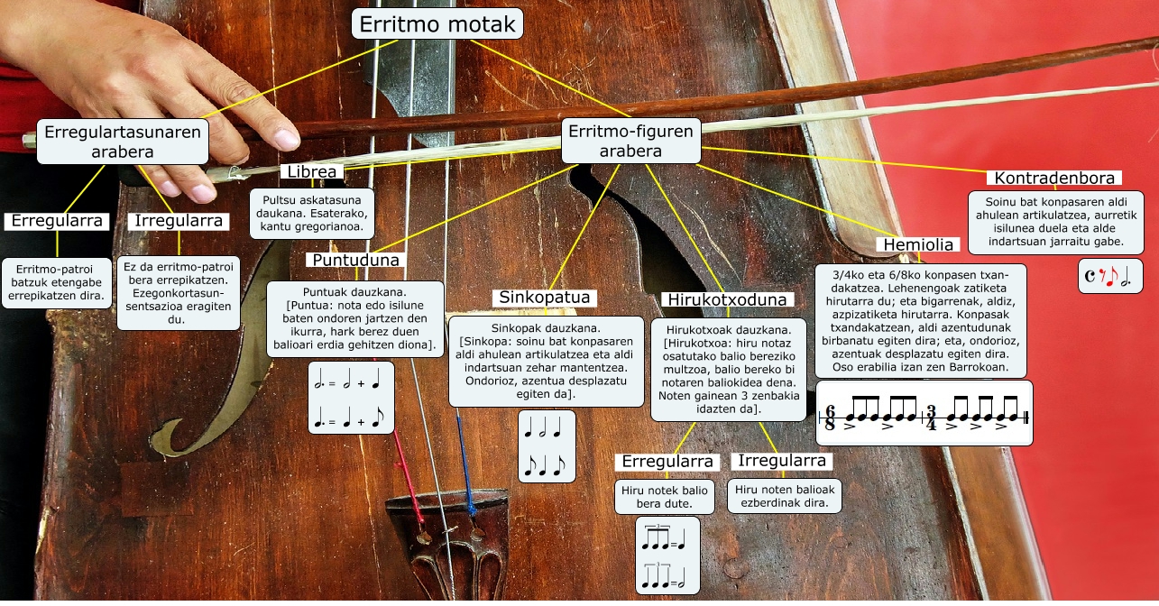 Este Cmap, tiene información relacionada con: erritmo_motak, Erregulartasunaren arabera Irregularra Ez da erritmo-patroi bera errepikatzen. Ezegonkortasun- sentsazioa eragiten du., Erritmo-figuren arabera Librea Pultsu askatasuna daukana. Esaterako, kantu gregorianoa., Erritmo-figuren arabera Hemiolia 3/4ko eta 6/8ko konpasen txan- dakatzea. Lehenengoak zatiketa hirutarra du; eta bigarrenak, aldiz, azpizatiketa hirutarra. Konpasak txandakatzean, aldi azentudunak birbanatu egiten dira; eta, ondorioz, azentuak desplazatu egiten dira. Oso erabilia izan zen Barrokoan., Erritmo-figuren arabera Sinkopatua Sinkopak dauzkana. [Sinkopa: soinu bat konpasaren aldi ahulean artikulatzea eta aldi indartsuan zehar mantentzea. Ondorioz, azentua desplazatu egiten da]., Erritmo-figuren arabera Puntuduna Puntuak dauzkana. [Puntua: nota edo isilune baten ondoren jartzen den ikurra, hark berez duen balioari erdia gehitzen diona]., Hirukotxoak dauzkana. [Hirukotxoa: hiru notaz osatutako balio bereziko multzoa, balio bereko bi notaren baliokidea dena. Noten gainean 3 zenbakia idazten da]. Irregularra Hiru noten balioak ezberdinak dira., Erritmo motak ???? Erritmo-figuren arabera, Erritmo motak ???? Erregulartasunaren arabera, Hirukotxoak dauzkana. [Hirukotxoa: hiru notaz osatutako balio bereziko multzoa, balio bereko bi notaren baliokidea dena. Noten gainean 3 zenbakia idazten da]. Erregularra Hiru notek balio bera dute., Erritmo-figuren arabera Kontradenbora Soinu bat konpasaren aldi ahulean artikulatzea, aurretik isilunea duela eta alde indartsuan jarraitu gabe., Erregulartasunaren arabera Erregularra Erritmo-patroi batzuk etengabe errepikatzen dira., Erritmo-figuren arabera Hirukotxoduna Hirukotxoak dauzkana. [Hirukotxoa: hiru notaz osatutako balio bereziko multzoa, balio bereko bi notaren baliokidea dena. Noten gainean 3 zenbakia idazten da].