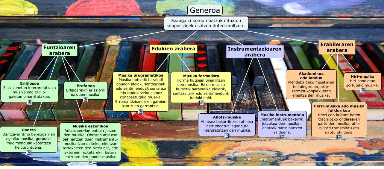 Este Cmap, tiene información relacionada con: Generoa, Ezaugarri komun batzuk dituzten konposizioek osatzen duten multzoa. Erabileraren arabera Akademikoa edo landua Mendebaldeko musikaren testuinguruan, arte- sormen konplexuaren emaitza den musika., Ezaugarri komun batzuk dituzten konposizioek osatzen duten multzoa. Edukien arabera Musika formalista Forma hutsean oinarritzen den musika. Ez du musika hutsetik haraindiko ideiarik, sentsaziorik edo sentimendurik iradoki nahi., Ezaugarri komun batzuk dituzten konposizioek osatzen duten multzoa. Erabileraren arabera Herri-musika edo musika folklorikoa Herri edo kultura baten tradiziozko ondarearen parte den musika, aho- belarri transmititu eta errotu ohi dena., Ezaugarri komun batzuk dituzten konposizioek osatzen duten multzoa. Edukien arabera Musika programatikoa Musika hutsetik haraindi dauden ideiak, sentsazioak edo sentimenduak sorrarazi edo iradokitzeko asmoz konposatutako musika. Erromantizismoaren garaian izan zuen garrantzia., Ezaugarri komun batzuk dituzten konposizioek osatzen duten multzoa. Funtzioaren arabera Erlijiosoa Elizkizunetan interpretatzeko musika edo erlijio- gaietan oinarritutakoa., Ezaugarri komun batzuk dituzten konposizioek osatzen duten multzoa. Funtzioaren arabera Dantza Dantza-erritmo bereizgarrian eginiko musika, gorputz- mugimenduak kateatzea helburu duena., Ezaugarri komun batzuk dituzten konposizioek osatzen duten multzoa. Instrumentazioaren arabera Musika instrumentala Instrumentuek bakarrik jotzekoa den musika: ahotsak parte hartzen ez duena., Ezaugarri komun batzuk dituzten konposizioek osatzen duten multzoa. Funtzioaren arabera Musika eszenikoa Antzezpen-lan batean jotzen den musika. Obraren atal oso bat hartzen duen instrumentu- musika izan daiteke, ekintzan tartekatzen den pieza bat, edo aktoreen hizketarekin batera entzuten den hondo-musika., Ezaugarri komun batzuk dituzten konposizioek osatzen duten multzoa. Erabileraren arabera Hiri-musika Hiri handietan sortutako musika., Ezaugarri komun batzuk dituzten konposizioek osatzen duten multzoa. Instrumentazioaren arabera Ahots-musika Ahotsez bakarrik zein ahotsa instrumentuz lagunduta interpretatzen den musika., Ezaugarri komun batzuk dituzten konposizioek osatzen duten multzoa. Funtzioaren arabera Profanoa Erlijioarekin erlaziorik ez duen musika.