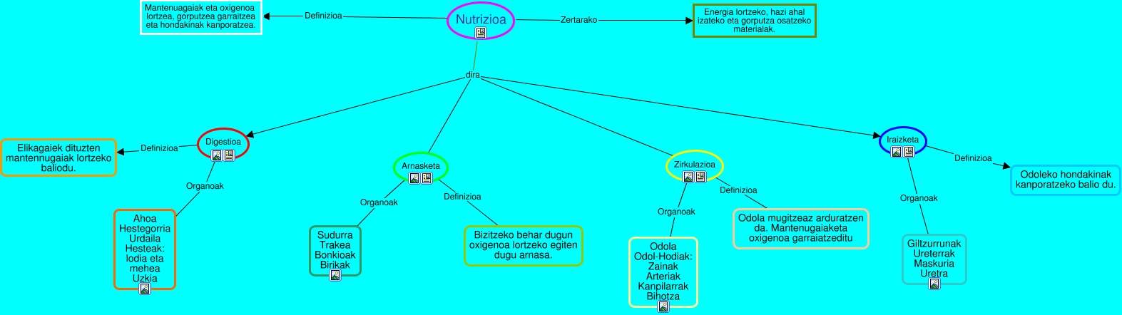This Concept Map, created with IHMC CmapTools, has information related to: Nutrizioa Jon Diez, Nutrizioa dira Arnasketa, Arnasketa Definizioa Bizitzeko behar dugun oxigenoa lortzeko egiten dugu arnasa., Digestioa Definizioa Elikagaiek dituzten mantennugaiak lortzeko baliodu., Nutrizioa dira Digestioa, Zirkulazioa Definizioa Odola mugitzeaz arduratzen da. Mantenugaiaketa oxigenoa garraiatzeditu, Nutrizioa Definizioa Mantenuagaiak eta oxigenoa lortzea, gorputzea garraitzea eta hondakinak kanporatzea., Nutrizioa dira Iraizketa, Nutrizioa dira Zirkulazioa, Arnasketa Organoak Sudurra Trakea Bonkioak Birikak, Digestioa Organoak Ahoa Hestegorria Urdaila Hesteak: lodia eta mehea Uzkia, Iraizketa Definizioa Odoleko hondakinak kanporatzeko balio du., Nutrizioa Zertarako Energia lortzeko, hazi ahal izateko eta gorputza osatzeko materialak., Zirkulazioa Organoak Odola Odol-Hodiak: Zainak Arteriak Kanpilarrak Bihotza, Iraizketa Organoak Giltzurrunak Ureterrak Maskuria Uretra