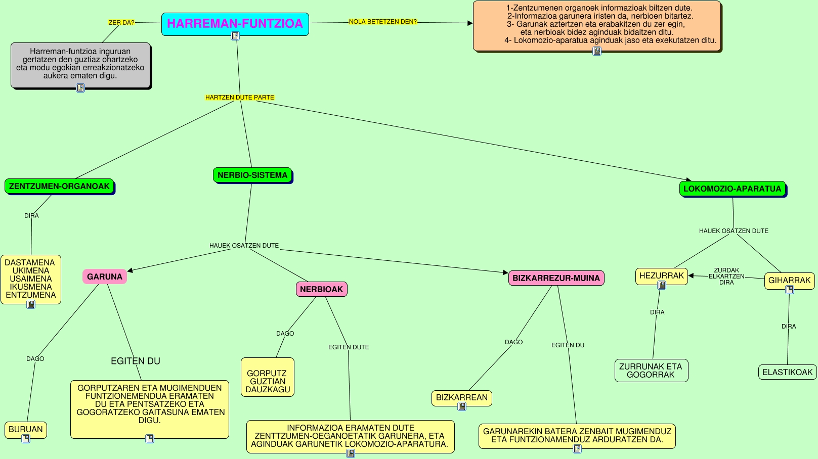 This Concept Map, created with IHMC CmapTools, has information related to: HARREMAN-FUNTZIOA, GARUNA EGITEN DU GORPUTZAREN ETA MUGIMENDUEN FUNTZIONEMENDUA ERAMATEN DU ETA PENTSATZEKO ETA GOGORATZEKO GAITASUNA EMATEN DIGU., LOKOMOZIO-APARATUA HAUEK OSATZEN DUTE HEZURRAK, NERBIO-SISTEMA HAUEK OSATZEN DUTE NERBIOAK, ZENTZUMEN-ORGANOAK DIRA DASTAMENA UKIMENA USAIMENA IKUSMENA ENTZUMENA, BIZKARREZUR-MUINA EGITEN DU GARUNAREKIN BATERA ZENBAIT MUGIMENDUZ ETA FUNTZIONAMENDUZ ARDURATZEN DA., NERBIO-SISTEMA HAUEK OSATZEN DUTE BIZKARREZUR-MUINA, NERBIOAK EGITEN DUTE INFORMAZIOA ERAMATEN DUTE ZENTTZUMEN-OEGANOETATIK GARUNERA, ETA AGINDUAK GARUNETIK LOKOMOZIO-APARATURA., HARREMAN-FUNTZIOA HARTZEN DUTE PARTE ZENTZUMEN-ORGANOAK, GIHARRAK ZURDAK ELKARTZEN DIRA HEZURRAK, BIZKARREZUR-MUINA DAGO BIZKARREAN, GARUNA DAGO BURUAN, GIHARRAK DIRA ELASTIKOAK, LOKOMOZIO-APARATUA HAUEK OSATZEN DUTE GIHARRAK, HARREMAN-FUNTZIOA HARTZEN DUTE PARTE LOKOMOZIO-APARATUA, HARREMAN-FUNTZIOA HARTZEN DUTE PARTE NERBIO-SISTEMA, NERBIOAK DAGO GORPUTZ GUZTIAN DAUZKAGU, HARREMAN-FUNTZIOA ZER DA? Harreman-funtzioa inguruan gertatzen den guztiaz ohartzeko eta modu egokian erreakzionatzeko aukera ematen digu., HARREMAN-FUNTZIOA NOLA BETETZEN DEN? 1-Zentzumenen organoek informazioak biltzen dute. 2-Informazioa garunera iristen da, nerbioen bitartez. 3- Garunak aztertzen eta erabakitzen du zer egin, eta nerbioak bidez aginduak bidaltzen ditu. 4- Lokomozio-aparatua aginduak jaso eta exekutatzen ditu., HEZURRAK DIRA ZURRUNAK ETA GOGORRAK, NERBIO-SISTEMA HAUEK OSATZEN DUTE GARUNA