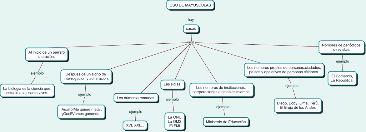 Este Cmap, tiene información relacionada con: USO DE MAYUSCULAS, Despues de un signo de interrogacion y admiración. son Nombres de periódicos o revistas., casos hay USO DE MAYÚSCULAS, Despues de un signo de interrogacion y admiración. son Los nombres propios de personas,ciudades, países y apelativos de personas célebres., Los números romanos. son Nombres de periódicos o revistas., Los números romanos. son Los nombres de instituciones, corrporaciones o establecimientos., Los nombres de instituciones, corrporaciones o establecimientos. ejemplo Ministerio de Educación, Los números romanos. son casos, Al inicio de un párrafo u oración. ejemplo La biologia es la ciencia que estudia a los seres vivos., Al inicio de un párrafo u oración. son casos, Los números romanos. son Los nombres propios de personas,ciudades, países y apelativos de personas célebres., Despues de un signo de interrogacion y admiración. son casos, Despues de un signo de interrogacion y admiración. son Las siglas., Al inicio de un párrafo u oración. son Nombres de periódicos o revistas., Al inicio de un párrafo u oración. son Los nombres de instituciones, corrporaciones o establecimientos., Despues de un signo de interrogacion y admiración. ejemplo ¡Auxilio!Me quiere matar, ¡Gool!Vamos ganando., Los números romanos. son Las siglas., Las siglas. ejemplo La ONU La OMS El FMI, Los nombres propios de personas,ciudades, países y apelativos de personas célebres. ejemplo Diego, Boby, Lima, Perú, El Brujo de los Andes, Despues de un signo de interrogacion y admiración. son Los nombres de instituciones, corrporaciones o establecimientos., Al inicio de un párrafo u oración. son Las siglas.