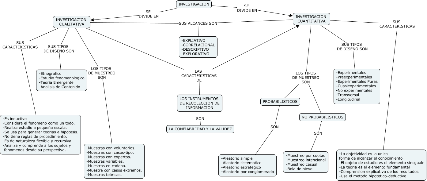 Este Cmap, tiene información relacionada con: INVESTIGACION, INVESTIGACION CUALITATIVA LAS CARACTERISTICAS DE INVESTIGACION CUANTITATIVA, INVESTIGACION CUANTITATIVA SUS TIPOS DE DISEÑO SON -Experimentales -Preexperimentales -Experimentales Puras -Cuasiexperimentales -No experimentales -Transversal -Longitudinal, INVESTIGACION CUALITATIVA LAS CARACTERISTICAS DE LOS INSTRUMENTOS DE RECOLECCION DE INFORMACION, INVESTIGACION CUALITATIVA LOS TIPOS DE MUESTREO SON -Muestras con voluntarios. -Muestras con casos-tipo. -Muestras con expertos. -Muestras variables. -Muestras en cadena. -Muestra con casos extremos. -Muestras teóricas., INVESTIGACION SE DIVIDE EN INVESTIGACION CUANTITATIVA, INVESTIGACION CUALITATIVA SUS TIPOS DE DISEÑO SON -Etnografico -Estudio fenomenologico -Teoria Emergente -Analisis de Contenido, INVESTIGACION CUANTITATIVA LOS TIPOS DE MUESTREO SON NO PROBABILISTICOS, INVESTIGACION CUANTITATIVA SUS CARACTERISTICAS -La objetividad es la unica forma de alcanzar el conocimiento -El objeto de estudio es el elemento sincgualr -La teoria es el elemento fundamental -Comprension explicativa de los resultados -Usa el metodo hipotetico-deductivo, INVESTIGACION CUANTITATIVA SUS ALCANCES SON -EXPLIATIVO -CORRELACIONAL -DESCRIPTIVO -EXPLORATIVO, INVESTIGACION CUALITATIVA SUS ALCANCES SON -EXPLIATIVO -CORRELACIONAL -DESCRIPTIVO -EXPLORATIVO, INVESTIGACION SE DIVIDE EN INVESTIGACION CUALITATIVA, LOS INSTRUMENTOS DE RECOLECCION DE INFORMACION SON LA CONFIABILIDAD Y LA VALIDEZ, INVESTIGACION CUANTITATIVA LOS TIPOS DE MUESTREO SON PROBABILISTICOS, NO PROBABILISTICOS SON -Muestreo por cuotas -Muestreo intencional -Muestreo casual -Bola de nieve, PROBABILISTICOS SON -Aleatorio simple -Aleatorio sistematico -Aleatorio estrategico -Aleatorio por conglomerado, INVESTIGACION CUALITATIVA SUS CARACTERISTICAS -Es inductivo -Considera el fenomeno como un todo. -Realiza estudio a pequeña escala. -Se usa para generar teorias e hipotesis. -No tiene reglas de procedimiento. -Es de naturaleza flexible y recursiva. -Analiza y comprende a los sujetos y fenomenos desde su perspectiva.