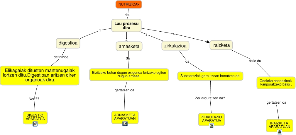 This Concept Map, created with IHMC CmapTools, has information related to: Nutrizioa_Unai Arcelus, NUTRIZIOAk ditu Lau prozesu dira, Lau prozesu dira 2 arnasketa, Lau prozesu dira 1 digestioa, Elikagaiak ditusten mantenugaiak lortzen ditu.Digestioan aritzen diren organoak dira. Non?? DIGESTIO APARATUA, arnasketa da Bizitzeko behar dugun oxigenoa lortzeko egiten dugun arnasa., Bizitzeko behar dugun oxigenoa lortzeko egiten dugun arnasa. gertatzen da ARNASKETA APARATUAN, Lau prozesu dira 3 zirkulazioa, Lau prozesu dira 4 iraizketa, iraizketa balio du Odoleko hondakinak kanporatzeko balio ., Substantziak gorputzean banatzea da. Zer arduratzen da? ZIRKULAZIO APARATUA, zirkulazioa da Substantziak gorputzean banatzea da., Odoleko hondakinak kanporatzeko balio . gertatzen da IRAIZKETA APARATUAN, digestioa definizioa Elikagaiak ditusten mantenugaiak lortzen ditu.Digestioan aritzen diren organoak dira.