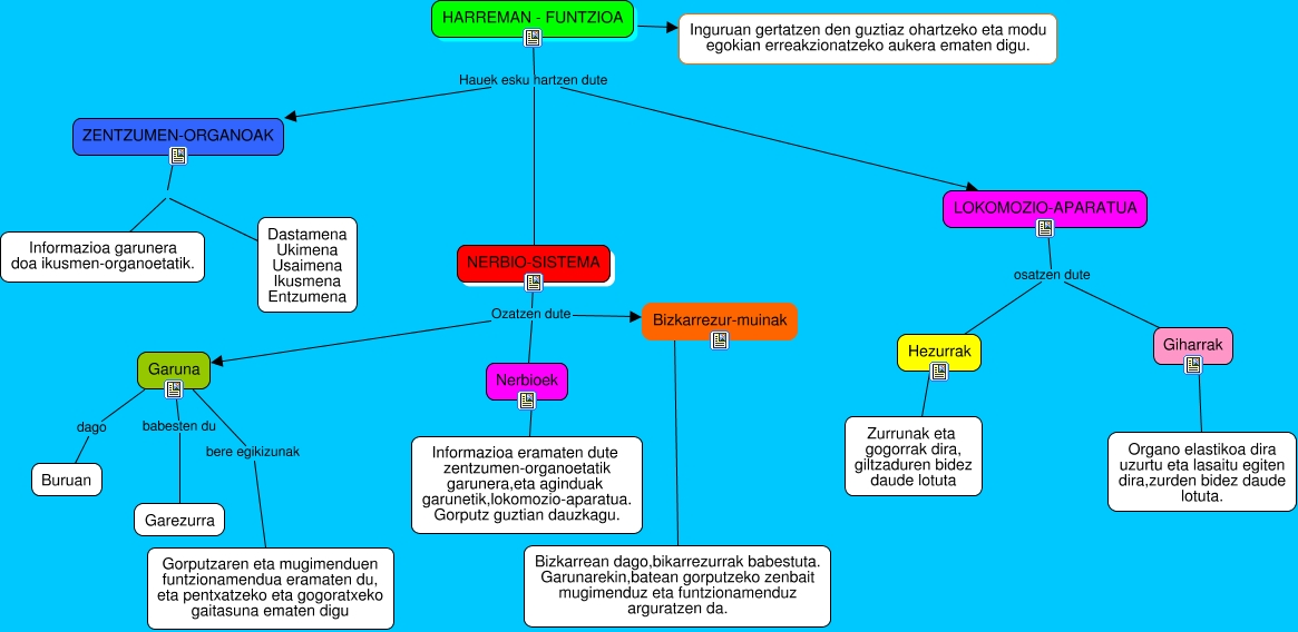 This Concept Map, created with IHMC CmapTools, has information related to: Cmap-0, HARREMAN - FUNTZIOA Hauek esku hartzen dute NERBIO-SISTEMA, HARREMAN - FUNTZIOA ???? Inguruan gertatzen den guztiaz ohartzeko eta modu egokian erreakzionatzeko aukera ematen digu., Garuna babesten du Garezurra, NERBIO-SISTEMA Ozatzen dute Bizkarrezur-muinak, LOKOMOZIO-APARATUA osatzen dute Hezurrak, Hezurrak ???? Zurrunak eta gogorrak dira, giltzaduren bidez daude lotuta, LOKOMOZIO-APARATUA osatzen dute Giharrak, Nerbioek ???? Informazioa eramaten dute zentzumen-organoetatik garunera,eta aginduak garunetik,lokomozio-aparatua. Gorputz guztian dauzkagu., Giharrak ???? Organo elastikoa dira uzurtu eta lasaitu egiten dira,zurden bidez daude lotuta., Bizkarrezur-muinak ???? Bizkarrean dago,bikarrezurrak babestuta. Garunarekin,batean gorputzeko zenbait mugimenduz eta funtzionamenduz arguratzen da., HARREMAN - FUNTZIOA Hauek esku hartzen dute ZENTZUMEN-ORGANOAK, ZENTZUMEN-ORGANOAK Informazioa garunera doa ikusmen-organoetatik., HARREMAN - FUNTZIOA Hauek esku hartzen dute LOKOMOZIO-APARATUA, NERBIO-SISTEMA Ozatzen dute Garuna, Garuna bere egikizunak Gorputzaren eta mugimenduen funtzionamendua eramaten du, eta pentxatzeko eta gogoratxeko gaitasuna ematen digu, Garuna dago Buruan, NERBIO-SISTEMA Ozatzen dute Nerbioek, ZENTZUMEN-ORGANOAK Dastamena Ukimena Usaimena Ikusmena Entzumena
