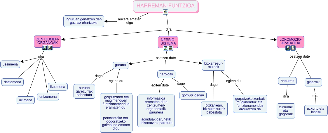 This Concept Map, created with IHMC CmapTools, has information related to: Harreman-funtzioa_Elsa, nerbioak dago gorputz osoan, ZENTZUMEN- ORGANOAK dira ukimena, ZENTZUMEN- ORGANOAK dira usaimena, ZENTZUMEN- ORGANOAK dira dastamena, HARREMAN-FUNTZIOA dira NERBIO- SISTEMA, ZENTZUMEN- ORGANOAK dira entzumena, giharrak dira uzkurtu eta lasaitu, LOKOMOZIO- APARATUA osatzen dute hezurrak, garuna egiten du gorputzaren eta mugimenduen funtzionamendua eramaten du pentsatzeko eta gogoratzeko gaitasuna ematen digu, HARREMAN-FUNTZIOA aukera ematen digu inguruan gertatzen den guztiaz ohartzeko, bizkarrezur- muinak egiten du gorputzeko zenbait mugimenduz eta funtzionamenduz arduratzen da, NERBIO- SISTEMA osatzen dute nerbioak, HARREMAN-FUNTZIOA dira LOKOMOZIO- APARATUA, HARREMAN-FUNTZIOA dira ZENTZUMEN- ORGANOAK, NERBIO- SISTEMA osatzen dute garuna, ZENTZUMEN- ORGANOAK dira ikusmena, nerbioak egiten dute informazioa eramaten dute zentzumen- organoetatik garunera aginduak garunetik lokomozio aparatura, hezurrak dira zurrunak eta gogorrak, garuna dago buruan garezurrak babestuta, bizkarrezur- muinak dago bizkarrean, bizkarrezurrak babestuta