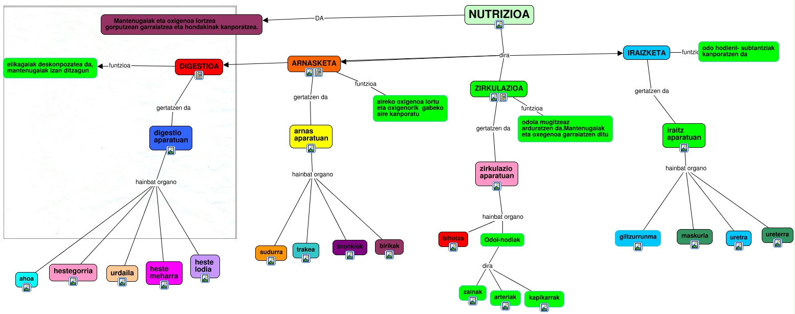 This Concept Map, created with IHMC CmapTools, has information related to: NUTRIZIOA, ZIRKULAZIOA gertatzen da zirkulazio aparatuan, ARNASKETA funtzioa aireko oxigenoa lortu eta oxigenorik gabeko aire kanporatu, iraitz aparatuan hainbat organo uretra, iraitz aparatuan hainbat organo maskuria, Odol-hodiak dira arteriak, digestio aparatuan hainbat organo ahoa, NUTRIZIOA dira IRAIZKETA, arnas aparatuan hainbat organo trakea, Odol-hodiak dira zainak, Odol-hodiak dira kapikarrak, arnas aparatuan hainbat organo birikak, digestio aparatuan hainbat organo urdaila, iraitz aparatuan hainbat organo ureterra, arnas aparatuan hainbat organo sudurra, DIGESTIOA funtzioa elikagaiak deskonpozatea da, mantenugaiak izan ditzagun, zirkulazio aparatuan hainbat organo Odol-hodiak, digestio aparatuan hainbat organo heste lodia, ZIRKULAZIOA funtzioa odola mugitzeaz arduratzen da.Mantenugaiak eta oxegenoa garraiatzen ditu, zirkulazio aparatuan hainbat organo bihotza, IRAIZKETA gertatzen da iraitz aparatuan