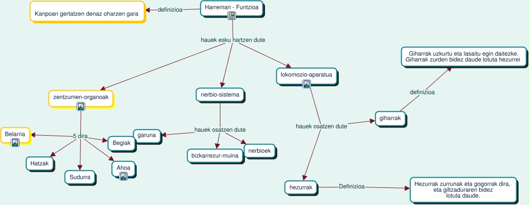 This Concept Map, created with IHMC CmapTools, has information related to: oier-kontzeptu-mapa, hezurrak Definizioa Hezurrak zurrunak eta gogorrak dira, eta giltzaduraren bidez lotuta daude., zentzumen-organoak 5 dira Hatzak, Harreman - Funtzioa hauek esku hartzen dute lokomozio-aparatua, nerbio-sistema hauek osatzen dute bizkarrezur-muina, nerbio-sistema hauek osatzen dute nerbioek, lokomozio-aparatua hauek osatzen dute hezurrak, Harreman - Funtzioa hauek esku hartzen dute nerbio-sistema, zentzumen-organoak 5 dira Belarria, nerbio-sistema hauek osatzen dute garuna, lokomozio-aparatua hauek osatzen dute giharrak, Harreman - Funtzioa hauek esku hartzen dute zentzumen-organoak, giharrak definizioa Giharrak uzkurtu eta lasaitu egin daitezke. Giharrak zurden bidez daude lotuta hezurrei, zentzumen-organoak 5 dira Begiak, Harreman - Funtzioa definizioa Kanpoan gertatzen denaz oharzen gara, zentzumen-organoak 5 dira Sudurra, zentzumen-organoak 5 dira Ahoa
