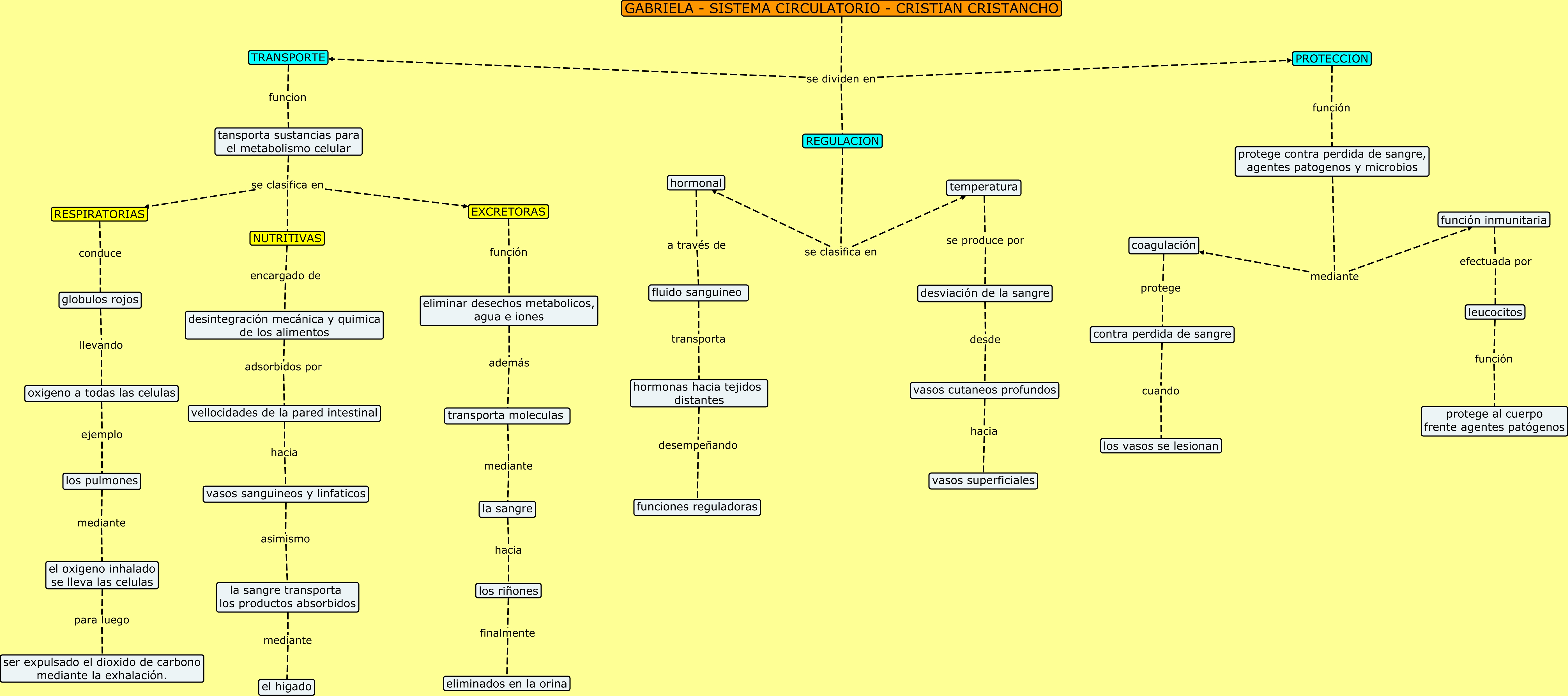 Este Cmap, tiene información relacionada con: GABRIELA-SISTEMA CIRCULATORIO, coagulación protege contra perdida de sangre, GABRIELA - SISTEMA CIRCULATORIO - CRISTIAN CRISTANCHO se dividen en TRANSPORTE, tansporta sustancias para el metabolismo celular se clasifica en NUTRITIVAS, la sangre transporta los productos absorbidos mediante el higado, tansporta sustancias para el metabolismo celular se clasifica en EXCRETORAS, hormonas hacia tejidos distantes desempeñando funciones reguladoras, GABRIELA - SISTEMA CIRCULATORIO - CRISTIAN CRISTANCHO se dividen en REGULACION, protege contra perdida de sangre, agentes patogenos y microbios mediante coagulación, vellocidades de la pared intestinal hacia vasos sanguineos y linfaticos, EXCRETORAS función eliminar desechos metabolicos, agua e iones, protege contra perdida de sangre, agentes patogenos y microbios mediante función inmunitaria, fluido sanguineo transporta hormonas hacia tejidos distantes, los pulmones mediante el oxigeno inhalado se lleva las celulas, desviación de la sangre desde vasos cutaneos profundos, vasos cutaneos profundos hacia vasos superficiales, vasos sanguineos y linfaticos asimismo la sangre transporta los productos absorbidos, PROTECCION función protege contra perdida de sangre, agentes patogenos y microbios, GABRIELA - SISTEMA CIRCULATORIO - CRISTIAN CRISTANCHO se dividen en PROTECCION, hormonal a través de fluido sanguineo, tansporta sustancias para el metabolismo celular se clasifica en RESPIRATORIAS