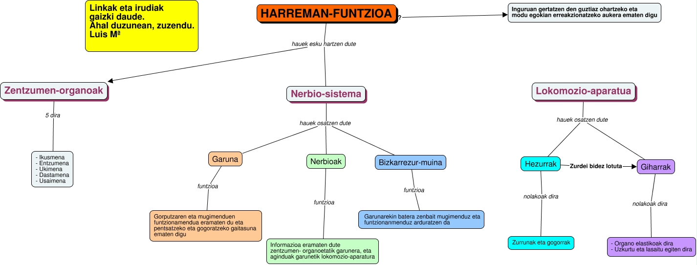 This Concept Map, created with IHMC CmapTools, has information related to: Harreman_Funtzioa_Laia_H, Nerbioak funtzioa Informazioa eramaten dute zentzumen- organoetatik garunera, eta aginduak garunetik lokomozio-aparatura, Lokomozio-aparatua hauek osatzen dute Hezurrak, Nerbio-sistema hauek osatzen dute Garuna, Garuna funtzioa Gorputzaren eta mugimenduen funtzionamendua eramaten du eta pentsatzeko eta gogoratzeko gaitasuna ematen digu, Nerbio-sistema hauek osatzen dute Nerbioak, Giharrak nolakoak dira - Organo elastikoak dira - Uzkurtu eta lasaitu egiten dira, HARREMAN-FUNTZIOA ???? Inguruan gertatzen den guztiaz ohartzeko eta modu egokian erreakzionatzeko aukera ematen digu, Zentzumen-organoak 5 dira - Ikusmena - Entzumena - Ukimena - Dastamena - Usaimena, Nerbio-sistema hauek osatzen dute Bizkarrezur-muina, HARREMAN-FUNTZIOA hauek esku hartzen dute Nerbio-sistema, Bizkarrezur-muina funtzioa Garunarekin batera zenbait mugimenduz eta funtzionanmenduz arduratzen da, Hezurrak Zurdei bidez lotuta Giharrak, Lokomozio-aparatua hauek osatzen dute Giharrak, HARREMAN-FUNTZIOA hauek esku hartzen dute Zentzumen-organoak, Hezurrak nolakoak dira Zurrunak eta gogorrak