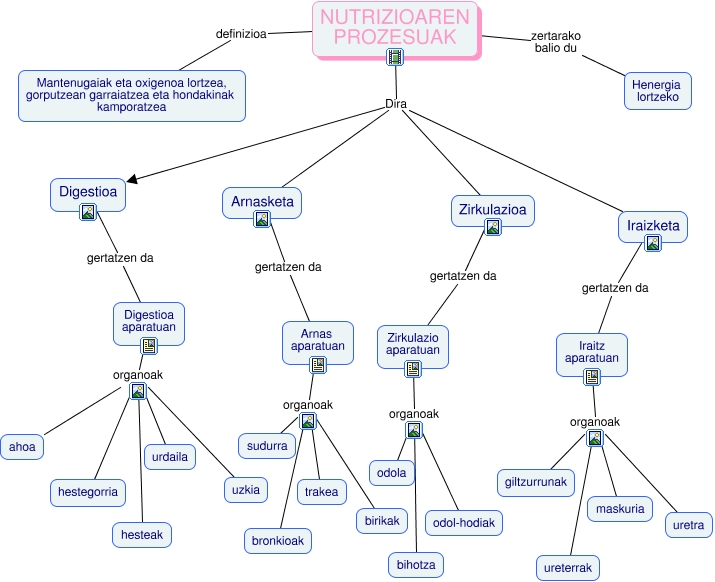 This Concept Map, created with IHMC CmapTools, has information related to: Nutrizioa _Elsa_Mancisidor, Zirkulazioa gertatzen da Zirkulazio aparatuan, Iraitz aparatuan organoak uretra, Iraizketa gertatzen da Iraitz aparatuan, Arnas aparatuan organoak birikak, Zirkulazio aparatuan organoak odola, Digestioa aparatuan organoak hesteak, Digestioa gertatzen da Digestioa aparatuan, Iraitz aparatuan organoak ureterrak, Digestioa aparatuan organoak hestegorria, NUTRIZIOAREN PROZESUAK Dira Digestioa, Iraitz aparatuan organoak maskuria, NUTRIZIOAREN PROZESUAK Dira Arnasketa, Arnas aparatuan organoak trakea, NUTRIZIOAREN PROZESUAK Dira Iraizketa, Iraitz aparatuan organoak giltzurrunak, NUTRIZIOAREN PROZESUAK definizioa Mantenugaiak eta oxigenoa lortzea, gorputzean garraiatzea eta hondakinak kamporatzea, Zirkulazio aparatuan organoak bihotza, Zirkulazio aparatuan organoak odol-hodiak, Arnas aparatuan organoak bronkioak, NUTRIZIOAREN PROZESUAK zertarako balio du Henergia lortzeko
