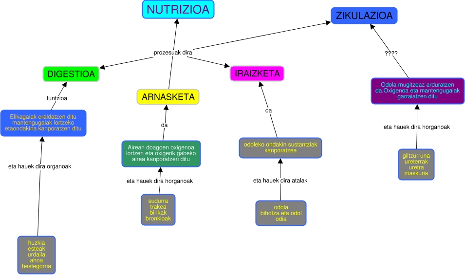 This Concept Map, created with IHMC CmapTools, has information related to: NUTRIZIOA, ARNASKETA prozesuak dira NUTRIZIOA, ARNASKETA prozesuak dira IRAIZKETA, ARNASKETA prozesuak dira ZIKULAZIOA, sudurra trakea birikak bronkioak eta hauek dira horganoak Airean doagoen oxigenoa lortzen eta oxigerik gabeko airea kanporatzen ditu, ARNASKETA prozesuak dira DIGESTIOA, Odola mugitzeaz arduratzen da.Oxigenoa eta mantengugaiak garraiatzen ditu ???? ZIKULAZIOA, odoleko ondakin sustantziak kanporatzea da IRAIZKETA, Elikagaiak eraldatzen ditu mantengugaiak lortzeko etaondakina kanporatzen ditu funtzioa DIGESTIOA, huzkia esteak urdaila ahoa hestegorria eta hauek dira organoak Elikagaiak eraldatzen ditu mantengugaiak lortzeko etaondakina kanporatzen ditu, Airean doagoen oxigenoa lortzen eta oxigerik gabeko airea kanporatzen ditu da ARNASKETA, odola bihotza eta odol odia eta hauek dira atalak odoleko ondakin sustantziak kanporatzea, giltzurruna ureterrak uretra maskuria eta hauek dira horganoak Odola mugitzeaz arduratzen da.Oxigenoa eta mantengugaiak garraiatzen ditu