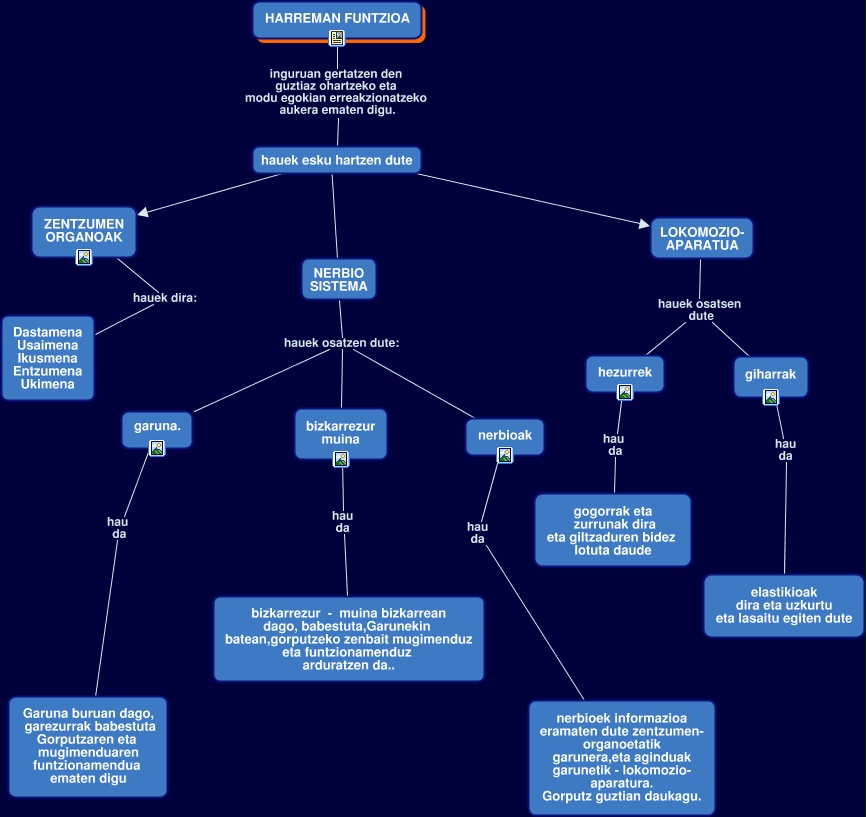 This Concept Map, created with IHMC CmapTools, has information related to: Harreman_Funtzioa_Alvaro, LOKOMOZIO- APARATUA hauek osatsen dute hezurrek, LOKOMOZIO- APARATUA hauek osatsen dute giharrak, NERBIO SISTEMA hauek osatzen dute: nerbioak, NERBIO SISTEMA hauek osatzen dute: bizkarrezur muina, nerbioak hau da nerbioek informazioa eramaten dute zentzumen- organoetatik garunera,eta aginduak garunetik - lokomozio- aparatura. Gorputz guztian daukagu., HARREMAN FUNTZIOA inguruan gertatzen den guztiaz ohartzeko eta modu egokian erreakzionatzeko aukera ematen digu. hauek esku hartzen dute, hauek esku hartzen dute ???? ZENTZUMEN ORGANOAK, giharrak hau da elastikioak dira eta uzkurtu eta lasaitu egiten dute, hauek esku hartzen dute ???? NERBIO SISTEMA, hauek esku hartzen dute ???? LOKOMOZIO- APARATUA, garuna. hau da Garuna buruan dago, garezurrak babestuta Gorputzaren eta mugimenduaren funtzionamendua ematen digu, bizkarrezur muina hau da bizkarrezur - muina bizkarrean dago, babestuta,Garunekin batean,gorputzeko zenbait mugimenduz eta funtzionamenduz arduratzen da.., ZENTZUMEN ORGANOAK hauek dira: Dastamena Usaimena Ikusmena Entzumena Ukimena, NERBIO SISTEMA hauek osatzen dute: garuna., hezurrek hau da gogorrak eta zurrunak dira eta giltzaduren bidez lotuta daude