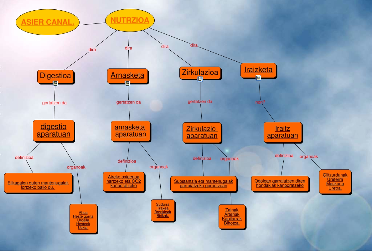 This Concept Map, created with IHMC CmapTools, has information related to: nutrizioa_Asier_Canal, digestio aparatuan definizioa Elikagaien duten mantenugaiak lortzeko balio du., digestio aparatuan organoak. Ahoa Heste gorria Urdaila Hesteak Uzkia., NUTRZIOA dira Digestioa, Arnasketa gertatzen da arnasketa aparatuan, Iraitz aparatuan organoak Giltzurdunak Ureterra Maskuria Uretra., Zirkulazio aparatuan organoak Zainak Arteriak Kapilarrak Bihotza., NUTRZIOA ???? ASIER CANAL., NUTRZIOA dira Iraizketa, NUTRZIOA dira Zirkulazioa, Digestioa gertatzen da digestio aparatuan, arnasketa aparatuan organoak Sudurra Trakea Bronkioak Birikak., Iraizketa non? Iraitz aparatuan, Zirkulazioa gertatzen da Zirkulazio aparatuan, Iraitz aparatuan definizioa Odolean garraiatzen diren hondakiak kanporatzeko, Zirkulazio aparatuan definizioa Substantzia eta mantenugaiak garraiatzeko gorputzean, arnasketa aparatuan definizioa Aireko oxigenoa hartzeko eta CO2 kanporatzeko, NUTRZIOA dira Arnasketa