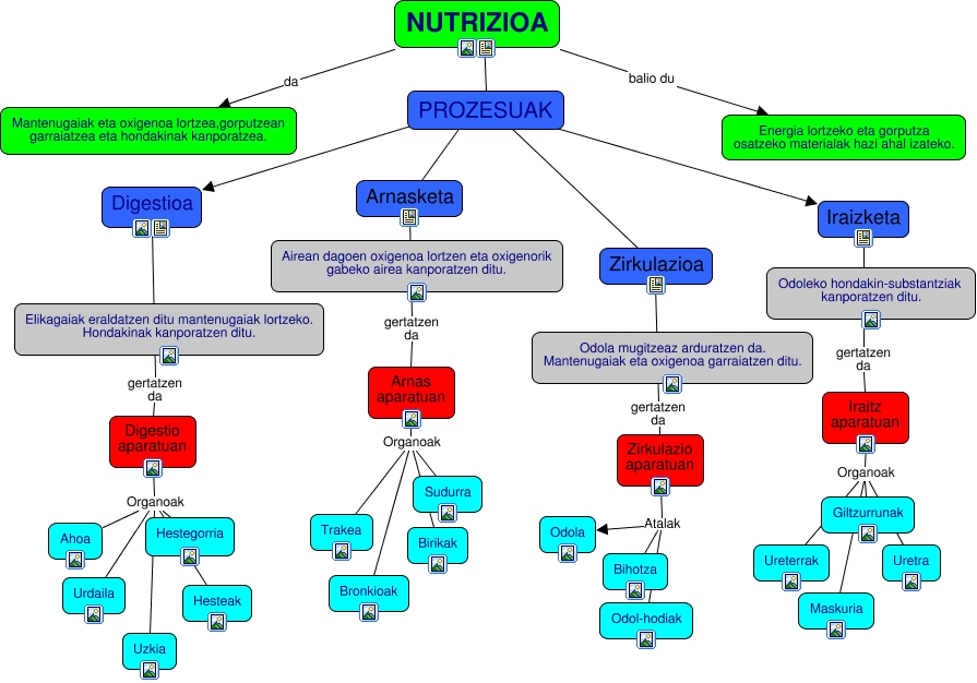 This Concept Map, created with IHMC CmapTools, has information related to: NUTRIZIOA_Laia_A, NUTRIZIOA balio du Energia lortzeko eta gorputza osatzeko materialak hazi ahal izateko., Iraitz aparatuan Organoak Giltzurrunak, PROZESUAK ???? Zirkulazioa, Zirkulazio aparatuan Atalak Odol-hodiak, NUTRIZIOA da Mantenugaiak eta oxigenoa lortzea,gorputzean garraiatzea eta hondakinak kanporatzea., NUTRIZIOA ???? PROZESUAK, Arnas aparatuan Organoak Bronkioak, Digestio aparatuan Organoak Urdaila, Digestioa gertatzen da Digestio aparatuan, Arnas aparatuan Organoak Sudurra, PROZESUAK ???? Digestioa, PROZESUAK ???? Iraizketa, Zirkulazio aparatuan Atalak Odola, Zirkulazio aparatuan Atalak Bihotza, Iraitz aparatuan Organoak Uretra, Digestio aparatuan Organoak Ahoa, PROZESUAK ???? Arnasketa, Digestio aparatuan Organoak Uzkia, Iraitz aparatuan Organoak Ureterrak, Zirkulazioa gertatzen da Zirkulazio aparatuan