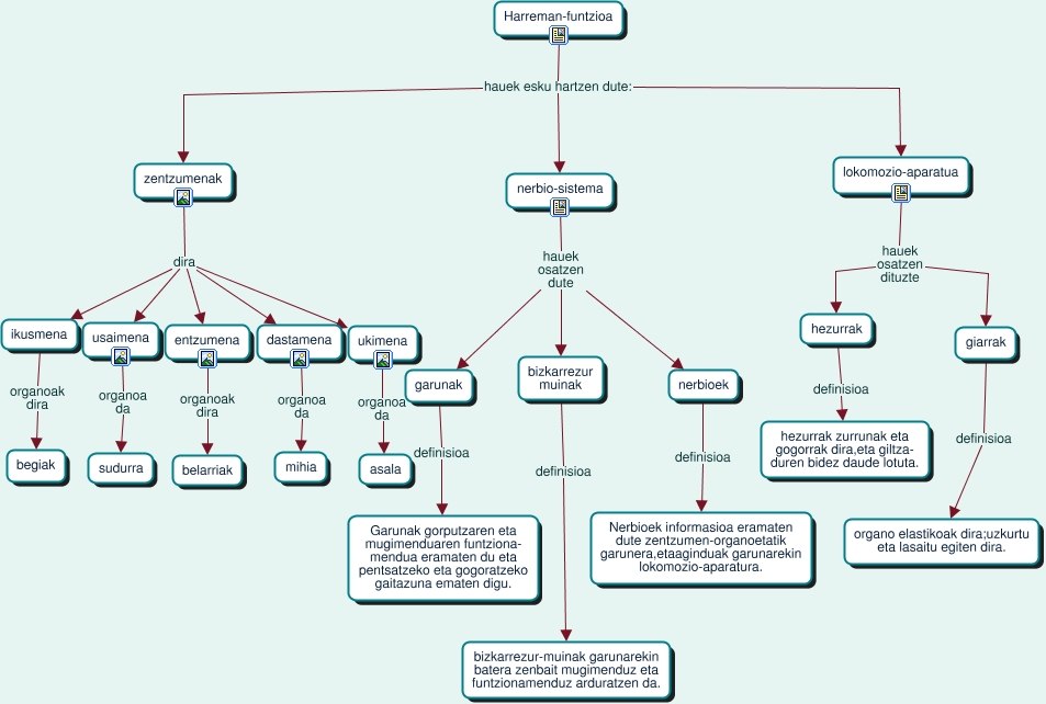 This Concept Map, created with IHMC CmapTools, has information related to: Alejandra_Vivar_Harreman-funtzioa, dastamena organoa da mihia, ikusmena organoak dira begiak, nerbio-sistema hauek osatzen dute garunak, nerbioek definisioa Nerbioek informasioa eramaten dute zentzumen-organoetatik garunera,etaaginduak garunarekin lokomozio-aparatura., usaimena organoa da sudurra, Harreman-funtzioa hauek esku hartzen dute: nerbio-sistema, nerbio-sistema hauek osatzen dute bizkarrezur muinak, zentzumenak dira ukimena, Harreman-funtzioa hauek esku hartzen dute: lokomozio-aparatua, garunak definisioa Garunak gorputzaren eta mugimenduaren funtziona- mendua eramaten du eta pentsatzeko eta gogoratzeko gaitazuna ematen digu., zentzumenak dira entzumena, lokomozio-aparatua hauek osatzen dituzte giarrak, hezurrak definisioa hezurrak zurrunak eta gogorrak dira,eta giltza- duren bidez daude lotuta., lokomozio-aparatua hauek osatzen dituzte hezurrak, entzumena organoak dira belarriak, bizkarrezur muinak definisioa bizkarrezur-muinak garunarekin batera zenbait mugimenduz eta funtzionamenduz arduratzen da., nerbio-sistema hauek osatzen dute nerbioek, zentzumenak dira ikusmena, zentzumenak dira dastamena, ukimena organoa da asala