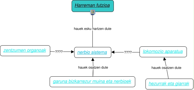 This Concept Map, created with IHMC CmapTools, has information related to: Cmap-0, lokomozio aparatua ???? nerbio sistema, nerbio sistema hauek esku hartzen dute Harreman futzioa, hezurrak eta giarrak hauek osatzen dute lokomozio aparatua, garuna bizkarrezur muina eta nerbioek hauek osatzen dute nerbio sistema, zentzumen organoak ???? nerbio sistema