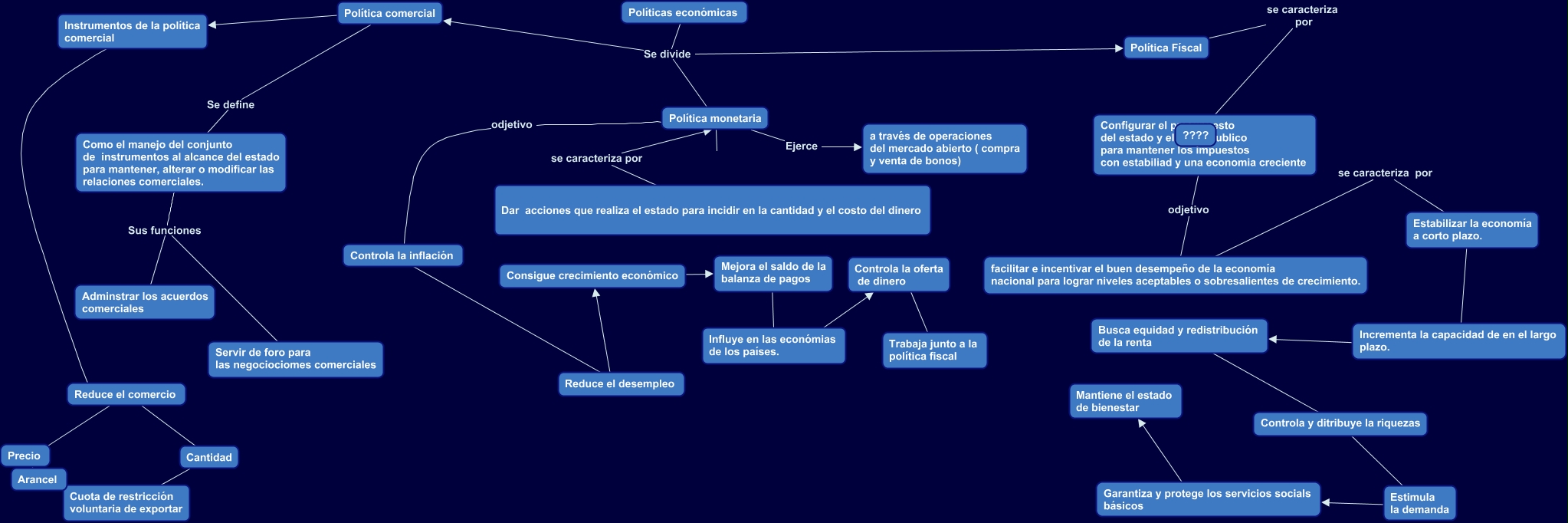 Este Cmap, tiene información relacionada con: políticas económicas, Estabilizar la economía a corto plazo. ???? Incrementa la capacidad de en el largo plazo., Controla la oferta de dinero T Trabaja junto a la política fiscal, Políticas económicas Se divide Política Físcal, Incrementa la capacidad de en el largo plazo. Busca equidad y redistribución de la renta, Reduce el desempleo ???? Consigue crecimiento económico, ???? ???? Reduce el comercio, Cantidad ???? Cuota de restricción voluntaria de exportar, Como el manejo del conjunto de instrumentos al alcance del estado para mantener, alterar o modificar las relaciones comerciales. Sus funciones Servir de foro para las negociociomes comerciales, Política comercial Se define Como el manejo del conjunto de instrumentos al alcance del estado para mantener, alterar o modificar las relaciones comerciales., Políticas económicas Se divide Política monetaria, Dar acciones que realiza el estado para incidir en la cantidad y el costo del dinero se caracteriza por Política monetaria, Garantiza y protege los servicios socials básicos ???? Mantiene el estado de bienestar, Configurar el presupuesto del estado y el gasto publico para mantener los impuestos con estabiliad y una economia creciente odjetivo facilitar e incentivar el buen desempeño de la economía nacional para lograr niveles aceptables o sobresalientes de crecimiento., facilitar e incentivar el buen desempeño de la economía nacional para lograr niveles aceptables o sobresalientes de crecimiento. se caracteriza por Estabilizar la economía a corto plazo., Política comercial ???? Instrumentos de la política comercial, Política Físcal se caracteriza por ????, Políticas económicas Se divide Política comercial, Política monetaria odjetivo Controla la inflación, Política monetaria Dar acciones que realiza el estado para incidir en la cantidad y el costo del dinero, Como el manejo del conjunto de instrumentos al alcance del estado para mantener, alterar o modificar las relaciones comerciales. Sus funciones Adminstrar los acuerdos comerciales