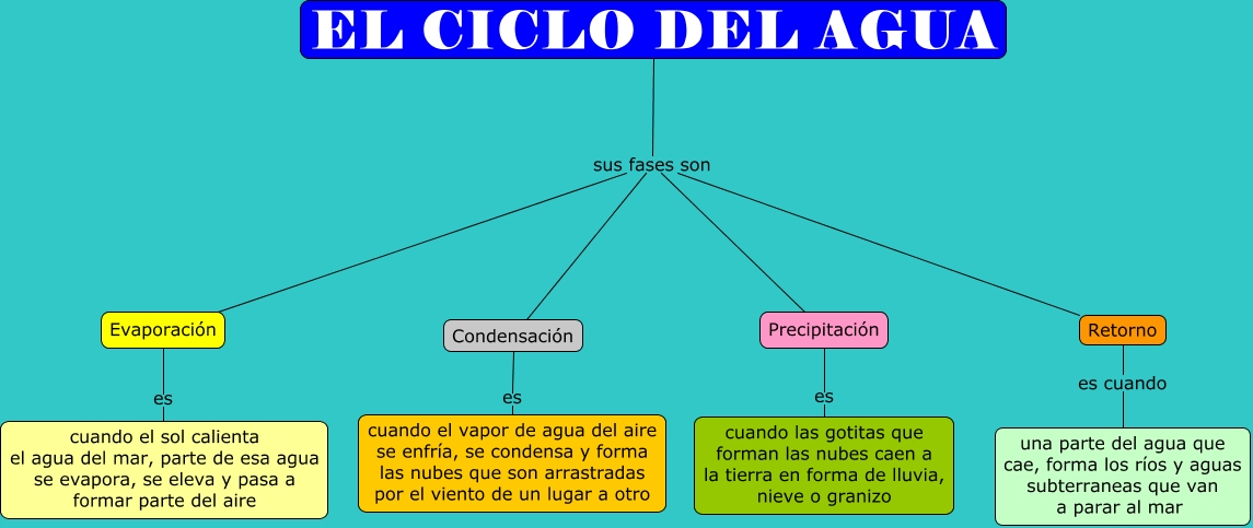 Este Cmap, tiene información relacionada con: El ciclo del agua, EL CICLO DEL AGUA sus fases son Retorno, EL CICLO DEL AGUA sus fases son Evaporación, Precipitación es cuando las gotitas que forman las nubes caen a la tierra en forma de lluvia, nieve o granizo, Evaporación es cuando el sol calienta el agua del mar, parte de esa agua se evapora, se eleva y pasa a formar parte del aire, EL CICLO DEL AGUA sus fases son Condensación, Condensación es cuando el vapor de agua del aire se enfría, se condensa y forma las nubes que son arrastradas por el viento de un lugar a otro, EL CICLO DEL AGUA sus fases son Precipitación, Retorno es cuando una parte del agua que cae, forma los ríos y aguas subterraneas que van a parar al mar