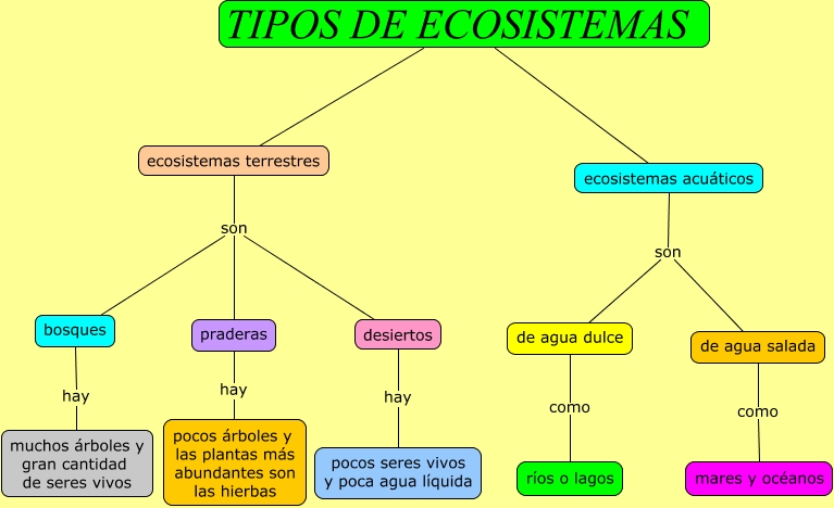 Este Cmap, tiene información relacionada con: Tipos de ecosistemas, ecosistemas acuáticos son de agua dulce, de agua salada como mares y océanos, praderas hay pocos árboles y las plantas más abundantes son las hierbas, ecosistemas acuáticos son de agua salada, ecosistemas terrestres son praderas, ecosistemas terrestres son desiertos, bosques hay muchos árboles y gran cantidad de seres vivos, TIPOS DE ECOSISTEMAS ecosistemas acuáticos, de agua dulce como ríos o lagos, TIPOS DE ECOSISTEMAS ecosistemas terrestres, ecosistemas terrestres son bosques, desiertos hay pocos seres vivos y poca agua líquida