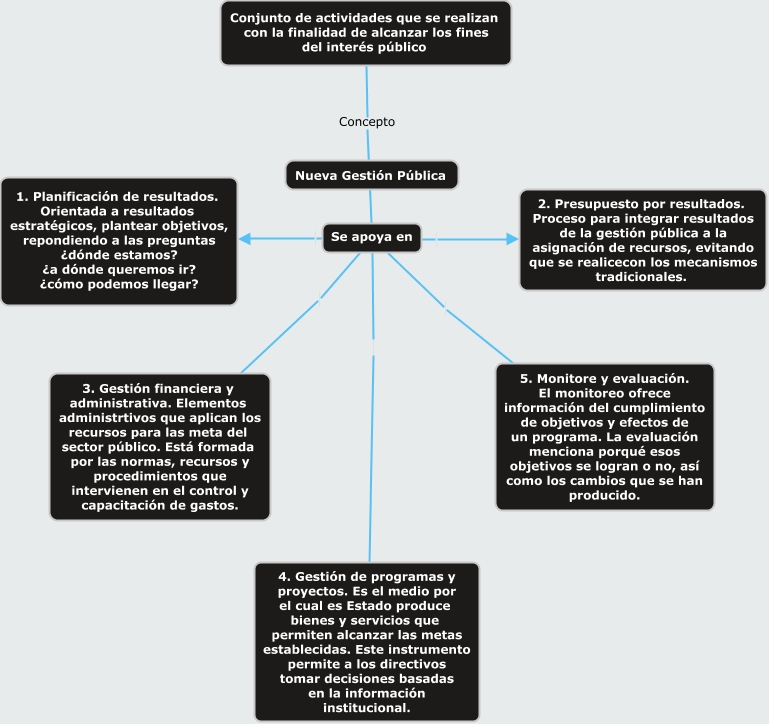 Este Cmap, tiene información relacionada con: Nueva gestion publica, Se apoya en 1. Planificación de resultados. Orientada a resultados estratégicos, plantear objetivos, repondiendo a las preguntas ¿dónde estamos? ¿a dónde queremos ir? ¿cómo podemos llegar?, Conjunto de actividades que se realizan con la finalidad de alcanzar los fines del interés público Concepto Se apoya en, Se apoya en 4. Gestión de programas y proyectos. Es el medio por el cual es Estado produce bienes y servicios que permiten alcanzar las metas establecidas. Este instrumento permite a los directivos tomar decisiones basadas en la información institucional., Se apoya en 5. Monitore y evaluación. El monitoreo ofrece información del cumplimiento de objetivos y efectos de un programa. La evaluación menciona porqué esos objetivos se logran o no, así como los cambios que se han producido., Se apoya en 2. Presupuesto por resultados. Proceso para integrar resultados de la gestión pública a la asignación de recursos, evitando que se realicecon los mecanismos tradicionales., Se apoya en 3. Gestión financiera y administrativa. Elementos administrtivos que aplican los recursos para las meta del sector público. Está formada por las normas, recursos y procedimientos que intervienen en el control y capacitación de gastos.