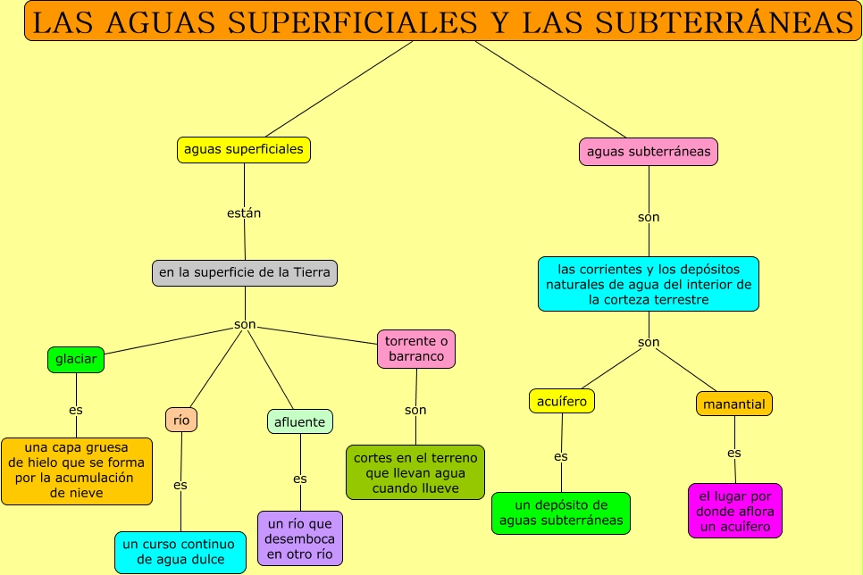 Este Cmap, tiene información relacionada con: Las aguas superficiales y las subterráneas, torrente o barranco son cortes en el terreno que llevan agua cuando llueve, en la superficie de la Tierra son torrente o barranco, en la superficie de la Tierra son glaciar, río es un curso continuo de agua dulce, LAS AGUAS SUPERFICIALES Y LAS SUBTERRÁNEAS aguas subterráneas, acuífero es un depósito de aguas subterráneas, aguas superficiales están en la superficie de la Tierra, LAS AGUAS SUPERFICIALES Y LAS SUBTERRÁNEAS aguas superficiales, glaciar es una capa gruesa de hielo que se forma por la acumulación de nieve, afluente es un río que desemboca en otro río, las corrientes y los depósitos naturales de agua del interior de la corteza terrestre son manantial, en la superficie de la Tierra son río, en la superficie de la Tierra son afluente, las corrientes y los depósitos naturales de agua del interior de la corteza terrestre son acuífero, manantial es el lugar por donde aflora un acuífero, aguas subterráneas son las corrientes y los depósitos naturales de agua del interior de la corteza terrestre