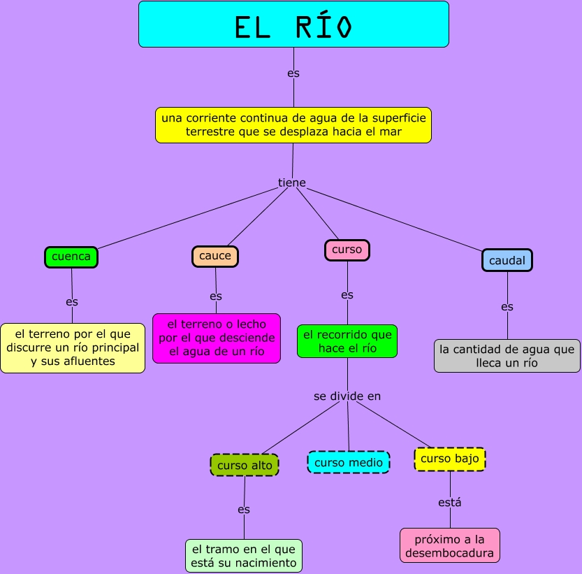 Este Cmap, tiene información relacionada con: Los ríos, una corriente continua de agua de la superficie terrestre que se desplaza hacia el mar tiene caudal, caudal es la cantidad de agua que lleca un río, curso alto es el tramo en el que está su nacimiento, el recorrido que hace el río se divide en curso medio, una corriente continua de agua de la superficie terrestre que se desplaza hacia el mar tiene curso, cauce es el terreno o lecho por el que desciende el agua de un río, curso es el recorrido que hace el río, el recorrido que hace el río se divide en curso bajo, curso bajo está próximo a la desembocadura, una corriente continua de agua de la superficie terrestre que se desplaza hacia el mar tiene cauce, cuenca es el terreno por el que discurre un río principal y sus afluentes, el recorrido que hace el río se divide en curso alto, una corriente continua de agua de la superficie terrestre que se desplaza hacia el mar tiene cuenca, EL RÍO es una corriente continua de agua de la superficie terrestre que se desplaza hacia el mar