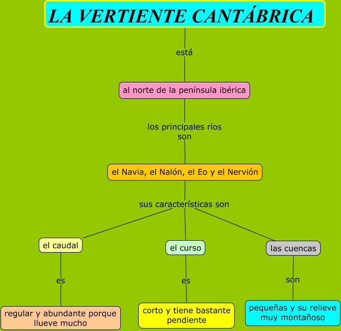 Este Cmap, tiene información relacionada con: La vertiente cantábrica, el curso es corto y tiene bastante pendiente, el Navia, el Nalón, el Eo y el Nervión sus características son el caudal, el Navia, el Nalón, el Eo y el Nervión sus características son el curso, LA VERTIENTE CANTÁBRICA está al norte de la península ibérica, el Navia, el Nalón, el Eo y el Nervión sus características son las cuencas, al norte de la península ibérica los principales ríos son el Navia, el Nalón, el Eo y el Nervión, las cuencas son pequeñas y su relieve muy montañoso, el caudal es regular y abundante porque llueve mucho