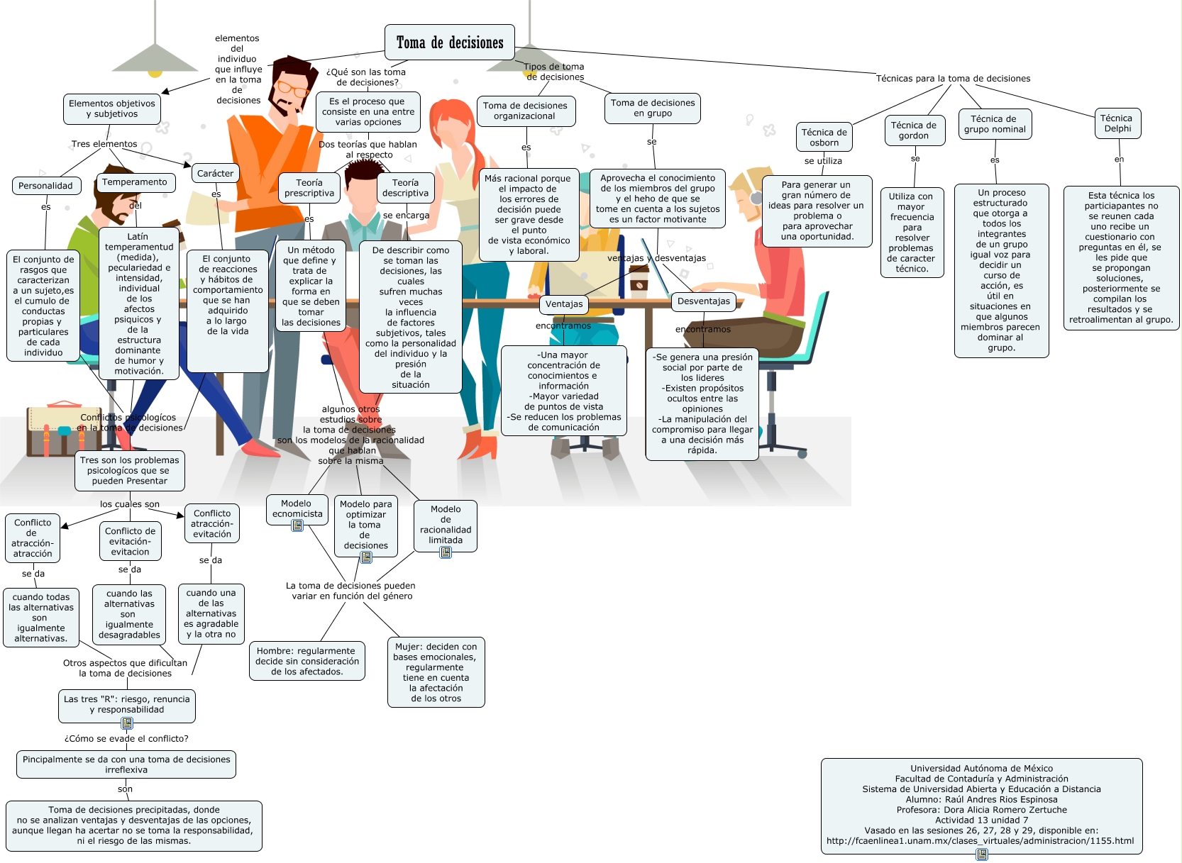 Este Cmap, tiene información relacionada con: Decisiones, Conflicto de evitación- evitacion se da cuando las alternativas son igualmente desagradables, Modelo ecnomicista La toma de decisiones pueden variar en función del género Hombre: regularmente decide sin consideración de los afectados., Es el proceso que consiste en una entre varias opciones Dos teorías que hablan al respecto Teoría prescriptiva, Toma de decisiones Tipos de toma de decisiones Toma de decisiones organizacionals, cuando las alternativas son igualmente desagradables Otros aspectos que dificultan la toma de decisiones Las tres "R": riesgo, renuncia y responsabilidad, Temperamento del Latín temperamentud (medida), peculariedad e intensidad, individual de los afectos psiquicos y de la estructura dominante de humor y motivación., De describir como se toman las decisiones, las cuales sufren muchas veces la influencia de factores subjetivos, tales como la personalidad del individuo y la presión de la situación algunos otros estudios sobre la toma de decisiones son los modelos de la racionalidad que hablan sobre la misma Modelo de racionalidad limitada, Desventajas encontramos -Se genera una presión social por parte de los lideres -Existen propósitos ocultos entre las opiniones -La manipulación del compromiso para llegar a una decisión más rápida., Modelo ecnomicista La toma de decisiones pueden variar en función del género Mujer: deciden con bases emocionales, regularmente tiene en cuenta la afectación de los otros, Modelo para optimizar la toma de decisiones La toma de decisiones pueden variar en función del género Mujer: deciden con bases emocionales, regularmente tiene en cuenta la afectación de los otros, Aprovecha el conocimiento de los miembros del grupo y el heho de que se tome en cuenta a los sujetos es un factor motivante ventajas y desventajas Ventajas, Modelo de racionalidad limitada La toma de decisiones pueden variar en función del género Hombre: regularmente decide sin consideración de los afectados., cuando una de las alternativas es agradable y la otra no Otros aspectos que dificultan la toma de decisiones Las tres "R": riesgo, renuncia y responsabilidad, Elementos objetivos y subjetivos Tres elementos Temperamento, Toma de decisiones organizacionals es Más racional porque el impacto de los errores de decisión puede ser grave desde el punto de vista económico y laboral., El conjunto de reacciones y hábitos de comportamiento que se han adquirido a lo largo de la vida Conflictos psicologícos en la toma de decisiones Tres son los problemas psicologícos que se pueden Presentar, Teoría prescriptiva es Un método que define y trata de explicar la forma en que se deben tomar las decisiones, Personalidad es El conjunto de rasgos que caracterizan a un sujeto,es el cumulo de conductas propias y particulares de cada individuo, Aprovecha el conocimiento de los miembros del grupo y el heho de que se tome en cuenta a los sujetos es un factor motivante ventajas y desventajas Desventajas, Pincipalmente se da con una toma de decisiones irreflexiva son Toma de decisiones precipitadas, donde no se analizan ventajas y desventajas de las opciones, aunque llegan ha acertar no se toma la responsabilidad, ni el riesgo de las mismas.