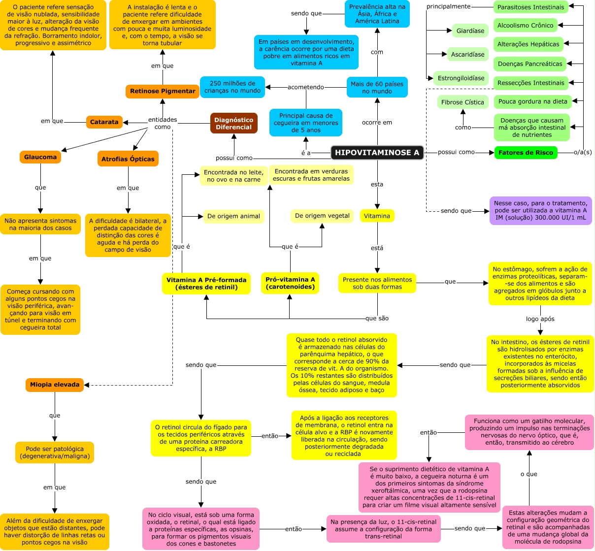 Esse mapa conceitual, produzido no IHMC CmapTools, tem a informação relacionada a: Hipovitaminose A - 1º caso, Pode ser patológica (degenerativa/maligna) em que Além da dificuldade de enxergar objetos que estão distantes, pode haver distorção de linhas retas ou pontos cegos na visão, Atrofias Ópticas em que A dificuldade é bilateral, a perdada capacidade de distinção das cores é aguda e há perda do campo de visão, O retinol circula do fígado para os tecidos periféricos através de uma proteína carreadora específica, a RBP então Após a ligação aos receptores de membrana, o retinol entra na célula alvo e a RBP é novamente liberada na circulação, sendo posteriormente degradada ou reciclada, Pró-vitamina A (carotenoides) que é De origem vegetal, Vitamina está Presente nos alimentos sob duas formas, Diagnóstico Diferencial entidades como Glaucoma, Quase todo o retinol absorvido é armazenado nas células do parênquima hepático, o que corresponde a cerca de 90% da reserva de vit. A do organismo. Os 10% restantes são distribuídos pelas células do sangue, medula óssea, tecido adiposo e baço sendo que O retinol circula do fígado para os tecidos periféricos através de uma proteína carreadora específica, a RBP, Fatores de Risco o/a(s) Alcoolismo Crônico, No intestino, os ésteres de retinil são hidrolisados por enzimas existentes no enterócito, incorporados às micelas formadas sob a influência de secreções biliares, sendo então posteriormente absorvidos sendo que Quase todo o retinol absorvido é armazenado nas células do parênquima hepático, o que corresponde a cerca de 90% da reserva de vit. A do organismo. Os 10% restantes são distribuídos pelas células do sangue, medula óssea, tecido adiposo e baço, Diagnóstico Diferencial entidades como Catarata, HIPOVITAMINOSE A possui como Fatores de Risco, Miopia elevada que Pode ser patológica (degenerativa/maligna), Fatores de Risco o/a(s) Doenças Pancreáticas, Presente nos alimentos sob duas formas que No estômago, sofrem a ação de enzimas proteolíticas, separam- -se dos alimentos e são agregados em glóbulos junto a outros lipídeos da dieta, Prevalência alta na Ásia, África e América Latina sendo que Em países em desenvolvimento, a carência ocorre por uma dieta pobre em alimentos ricos em vitamina A, HIPOVITAMINOSE A é a Principal causa de cegueira em menores de 5 anos, Ressecções Intestinais sendo que Nesse caso, para o tratamento, pode ser utilizada a vitamina A IM (solução) 300.000 UI/1 mL, HIPOVITAMINOSE A esta Vitamina, HIPOVITAMINOSE A ocorre em Mais de 60 países no mundo, Fatores de Risco o/a(s) Pouca gordura na dieta