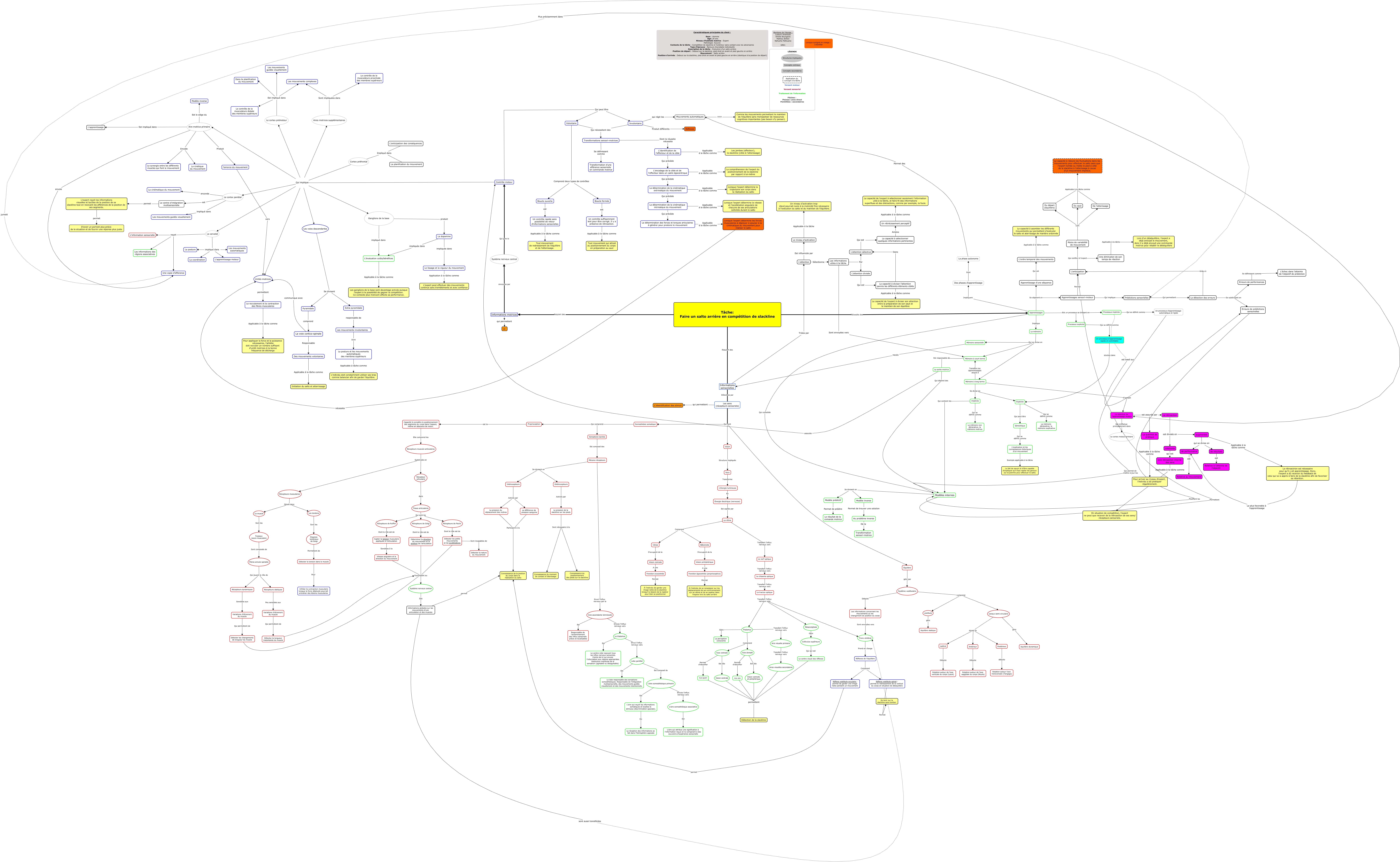 Cette carte de concepts créée avec IHMC CmapTools traite de: Sans titre X, Récepteurs musculaires Situés dans Les tendons, Capter la tension musculaire appliquée à l'articulation Sensibles à la Vitesse angulaire et la direction du mouvement, De l'atterissage Applicable à la tâche comme La capacité à réduire les fluctuations dans les mouvements pour effectuer le salto sans que l'expert tombe ou mette le pied à côté de la slackline à l'atterissage à cause d'un mouvement imprécis., Informations motrices qui permettent La, Récepteurs statiques Peu sensibles aux Variations d'étirement du muscle, Fonction exocentrée Permet À l'individu de garder une image nette de la slackline lorsqu'il a besoin de la repérer pour bien se positionner, Le thalamus Est Le centre-relai reçevant tous les influx nerveux sensoriels. Centre de tri qui envoie l'information aux régions appropriées. Distinction imprécise de la sensation (agréable ou désagréable)., Tâche: Faire un salto arrière en compétition de slackline Nécessite des Apprentissages, Sémentique Qui se définit comme L'explication et les connaissances théoriques d'un mouvement, L'identification de l'effecteur et de la cible Applicable à la tâche comme Les jambes (effecteur), la slackline (cible à l'atterissage), Aire visuelle primaire Transfert l'influx nerveux vers Aires visuelles secondaires, Détecter la tension dans le muscle Pour Inhiber la contraction musculaire lorsque la force déployée pourrait entraîner des lésions musculaires, «Le quoi» permettent Détection de la slackline, Un processus d'apprentissage automatique et rigide Qui permet de mettre à jour les Modèles internes, Voie ascendante lemniscale Est Responsable de l'acheminement des influx sensoriels précis et localisables, Mouvements automatiques ???? Comme les mouvements permettant le maintien de l'équilibre sans monopoliser de ressources cognitives importantes (pas besoin d'y penser)., Le lissage et la vigueur du mouvement Application à la tâche comme L'expert peut effectuer des mouvements continus sans tremblements et avec confiance, Informations sensorielles Détectées par Les sens (récepteurs sensoriels), Les sens (récepteurs sensoriels) qui permettent L'ideentification des stimuli, Récepteur articulaire dans Tissus articulaires