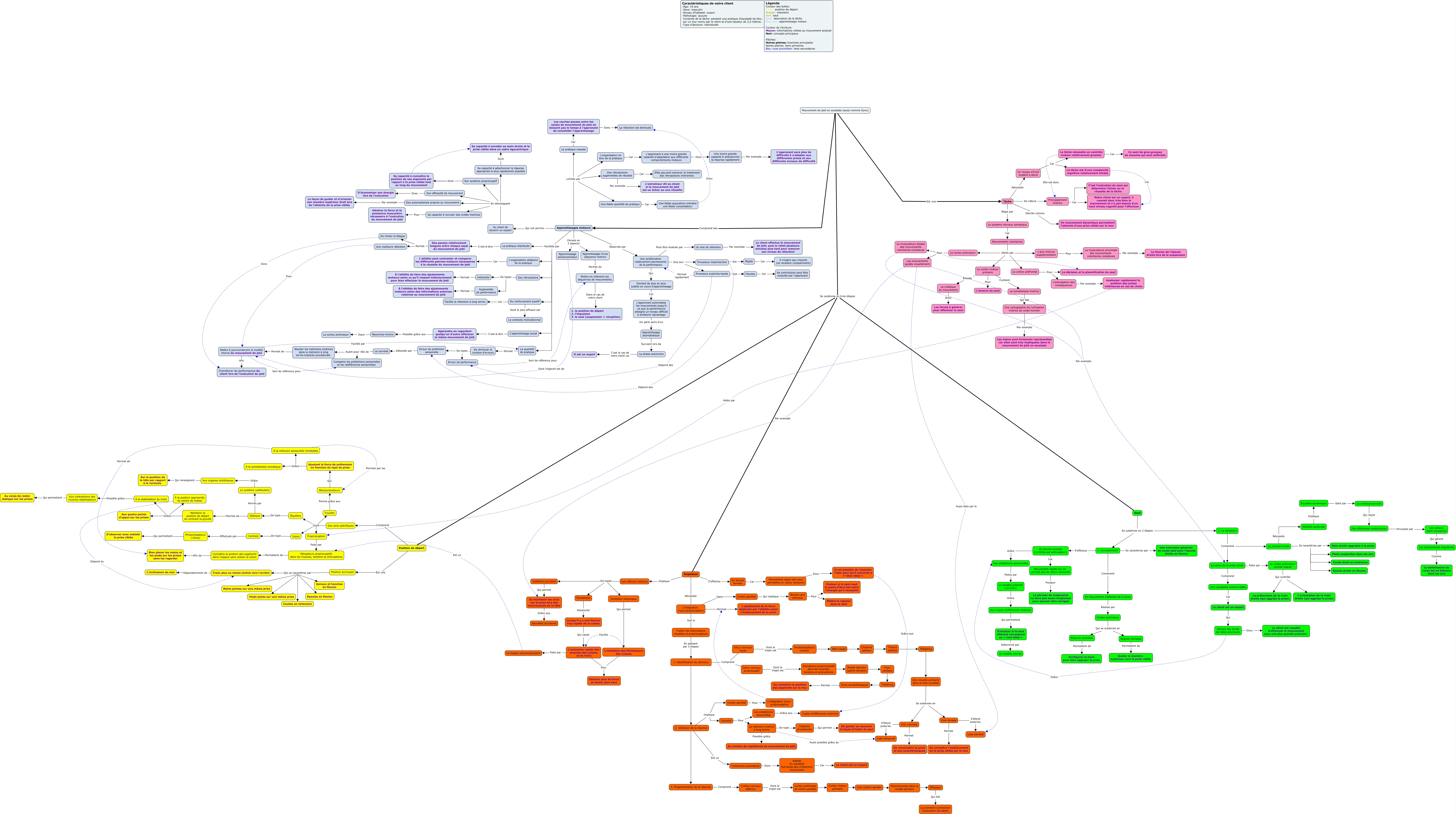 Cette carte de concepts créée avec IHMC CmapTools traite de: Dyno contrôle moteur 2, Des sens spécifiques Dont Toucher, Aux organes otolithiques Qui renseignent Sur la position de la tête par rapport à la verticale, Les mouvements guidés visuellement Aussi faits par le Lobe pariétal, Cervelet Pour Les prédictions sensorielles, Une amélioration relativement permanente de la performance Due aux Processus implicite/lent, Mettre en mémoire les séquences de mouvements Dans le cas de notre client 1. la position de départ 2. l'impulsion 3. le saut (suspension + réception), La position finale Se caractérise par Épaule droite en flexion, Mouvement de jeté en escalade (aussi nommé Dyno) Comprend des Apprentissages moteurs, 1. La suspension Comprend Un mouvement d'atteinte de la prise, La cinétique du mouvement Donc Les forces à générer pour effectuer le saut, Voie dorsale Permet De connaître l'emplacement de la prise ciblée sur le mur, Le client est un expert Qui Génère des bruits de faible amplitude, Une cartographie de l'utilisation motrice du corps humain Par exemple Les mains sont fortement représentées car elles sont très impliquées dans le mouvement de jeté en escalade, Le cervelet Ayant pour rôle de Comparer les prédictions sensorielles et les réafférences sensorielles, Traiter les informations visuelles et proprioceptives En passant par 3 étapes 1. Identification du stimulus, Mettre à jour/construire le modèle interne du mouvement de jeté Facilité par La quantité de pratique, Traitement automatisé Donc Rapide En parallèle Demande peu d'attention Inconscient, Flexible Car Sa contribution peut être modulée par l'apprenant, Saut Se subdivise en 2 étapes 2. La réception, Stocker les mémoires motrices dans la mémoire à long terme implicite procédurale Permet de Mettre à jour/construire le modèle interne du mouvement de jeté