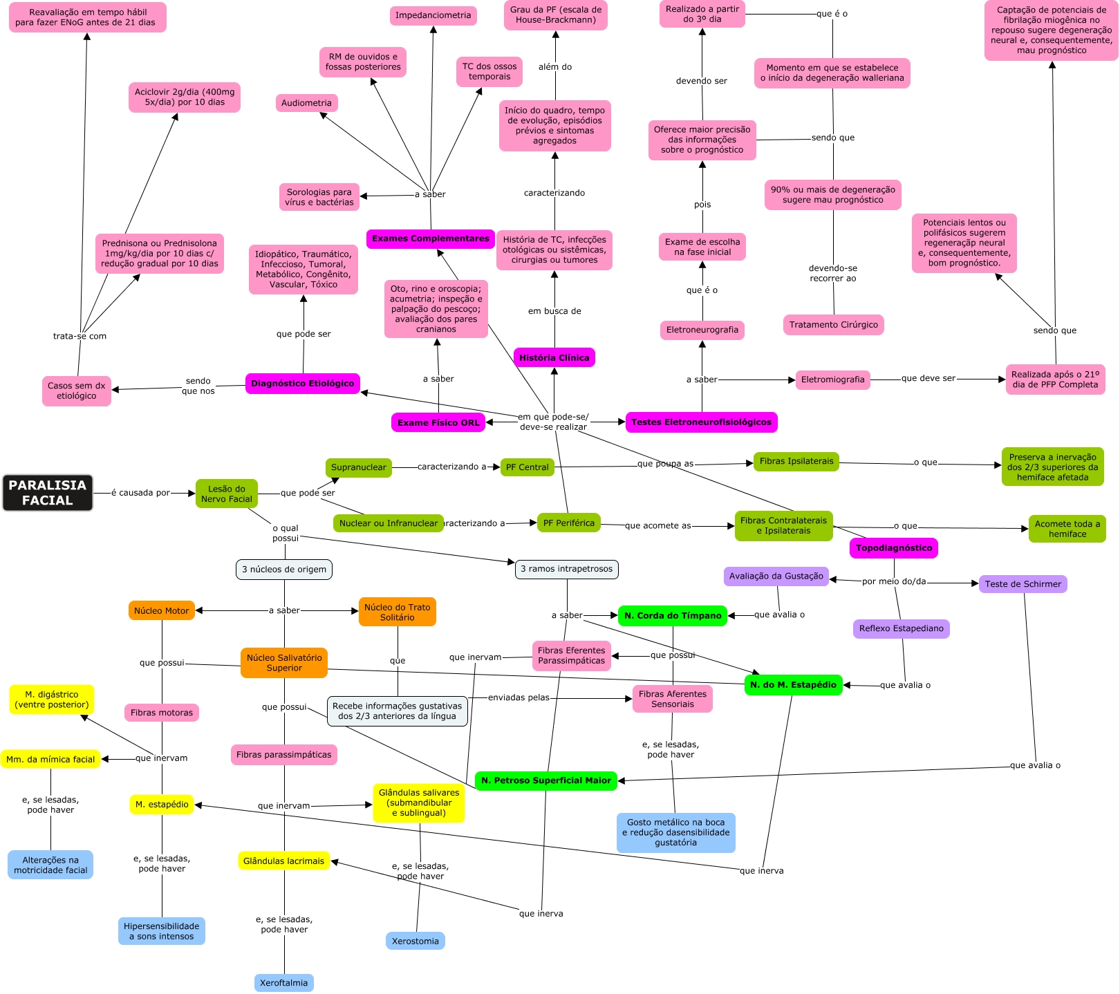 Esse mapa conceitual, produzido no IHMC CmapTools, tem a informação relacionada a: Paralisia Facial - 4º caso, Exame Físico ORL a saber Oto, rino e oroscopia; acumetria; inspeção e palpação do pescoço; avaliação dos pares cranianos, PF Periférica em que pode-se/ deve-se realizar Topodiagnóstico, Avaliação da Gustação que avalia o N. Corda do Tímpano, PF Periférica em que pode-se/ deve-se realizar Testes Eletroneurofisiológicos, 3 núcleos de origem a saber Núcleo Motor, Recebe informações gustativas dos 2/3 anteriores da língua enviadas pelas Fibras Aferentes Sensoriais, Fibras Contralaterais e Ipsilaterais o que Acomete toda a hemiface, Exame de escolha na fase inicial pois Oferece maior precisão das informações sobre o prognóstico, 3 núcleos de origem a saber Núcleo Salivatório Superior, PF Periférica em que pode-se/ deve-se realizar Diagnóstico Etiológico, Oferece maior precisão das informações sobre o prognóstico sendo que 90% ou mais de degeneração sugere mau prognóstico, Fibras motoras que inervam Mm. da mímica facial, Glândulas salivares (submandibular e sublingual) e, se lesadas, pode haver Xerostomia, Eletroneurografia que é o Exame de escolha na fase inicial, Topodiagnóstico por meio do/da Avaliação da Gustação, PF Periférica em que pode-se/ deve-se realizar Exame Físico ORL, PF Periférica que acomete as Fibras Contralaterais e Ipsilaterais, PF Central que poupa as Fibras Ipsilaterais, Testes Eletroneurofisiológicos a saber Eletroneurografia, Núcleo do Trato Solitário que Recebe informações gustativas dos 2/3 anteriores da língua