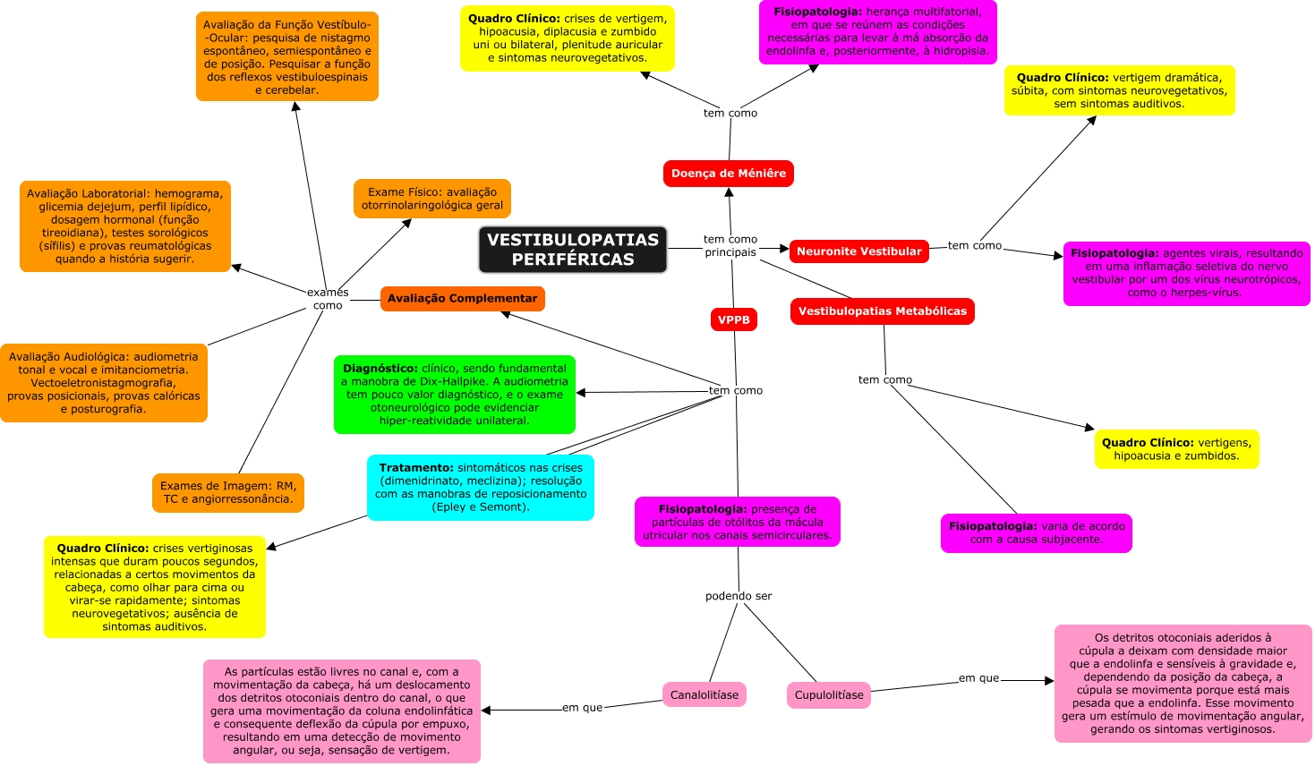Esse mapa conceitual, produzido no IHMC CmapTools, tem a informação relacionada a: VPPB - 3º caso, Avaliação Complementar exames como Exame Físico: avaliação otorrinolaringológica geral, Neuronite Vestibular tem como Quadro Clínico: vertigem dramática, súbita, com sintomas neurovegetativos, sem sintomas auditivos., Doença de Méniêre tem como Quadro Clínico: crises de vertigem, hipoacusia, diplacusia e zumbido uni ou bilateral, plenitude auricular e sintomas neurovegetativos., VESTIBULOPATIAS PERIFÉRICAS tem como principais Neuronite Vestibular, VPPB tem como Tratamento: sintomáticos nas crises (dimenidrinato, meclizina); resolução com as manobras de reposicionamento (Epley e Semont)., Avaliação Complementar exames como Avaliação da Função Vestíbulo- -Ocular: pesquisa de nistagmo espontâneo, semiespontâneo e de posição. Pesquisar a função dos reflexos vestibuloespinais e cerebelar., Canalolitíase em que As partículas estão livres no canal e, com a movimentação da cabeça, há um deslocamento dos detritos otoconiais dentro do canal, o que gera uma movimentação da coluna endolinfática e consequente deflexão da cúpula por empuxo, resultando em uma detecção de movimento angular, ou seja, sensação de vertigem., Avaliação Complementar exames como Avaliação Audiológica: audiometria tonal e vocal e imitanciometria. Vectoeletronistagmografia, provas posicionais, provas calóricas e posturografia., Neuronite Vestibular tem como Fisiopatologia: agentes virais, resultando em uma inflamação seletiva do nervo vestibular por um dos vírus neurotrópicos, como o herpes-vírus., Vestibulopatias Metabólicas tem como Fisiopatologia: varia de acordo com a causa subjacente., Fisiopatologia: presença de partículas de otólitos da mácula utricular nos canais semicirculares. podendo ser Canalolitíase, Fisiopatologia: presença de partículas de otólitos da mácula utricular nos canais semicirculares. podendo ser Cupulolitíase, VPPB tem como Diagnóstico: clínico, sendo fundamental a manobra de Dix-Hallpike. A audiometria tem pouco valor diagnóstico, e o exame otoneurológico pode evidenciar hiper-reatividade unilateral., VESTIBULOPATIAS PERIFÉRICAS tem como principais Vestibulopatias Metabólicas, Avaliação Complementar exames como Exames de Imagem: RM, TC e angiorressonância., VPPB tem como Avaliação Complementar, VPPB tem como Fisiopatologia: presença de partículas de otólitos da mácula utricular nos canais semicirculares., Avaliação Complementar exames como Avaliação Laboratorial: hemograma, glicemia dejejum, perfil lipídico, dosagem hormonal (função tireoidiana), testes sorológicos (sífilis) e provas reumatológicas quando a história sugerir., VPPB tem como Quadro Clínico: crises vertiginosas intensas que duram poucos segundos, relacionadas a certos movimentos da cabeça, como olhar para cima ou virar-se rapidamente; sintomas neurovegetativos; ausência de sintomas auditivos., Cupulolitíase em que Os detritos otoconiais aderidos à cúpula a deixam com densidade maior que a endolinfa e sensíveis à gravidade e, dependendo da posição da cabeça, a cúpula se movimenta porque está mais pesada que a endolinfa. Esse movimento gera um estímulo de movimentação angular, gerando os sintomas vertiginosos.