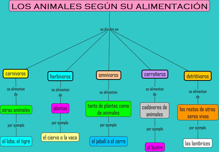 Este Cmap, tiene información relacionada con: Los animales según su alimentación, detritívoros se alimentan de los restos de otros seres vivos, LOS ANIMALES SEGÚN SU ALIMENTACIÓN se dividen en omnívoros, cadáveres de animales por ejemplo el buitre, LOS ANIMALES SEGÚN SU ALIMENTACIÓN se dividen en detritívoros, tanto de plantas como de animales por ejemplo el jabalí o el zorro, omnívoros se alimentan tanto de plantas como de animales, los restos de otros seres vivos por ejemplo las lombrices, LOS ANIMALES SEGÚN SU ALIMENTACIÓN se dividen en carroñeros, plantas por ejemplo el ciervo o la vaca, herbívoros se alimentan de plantas, carroñeros se alimentan de cadáveres de animales, LOS ANIMALES SEGÚN SU ALIMENTACIÓN se dividen en herbívoros, otros animales por ejemplo el lobo, el tigre, LOS ANIMALES SEGÚN SU ALIMENTACIÓN se dividen en carnívoros, carnívoros se alimentan de otros animales