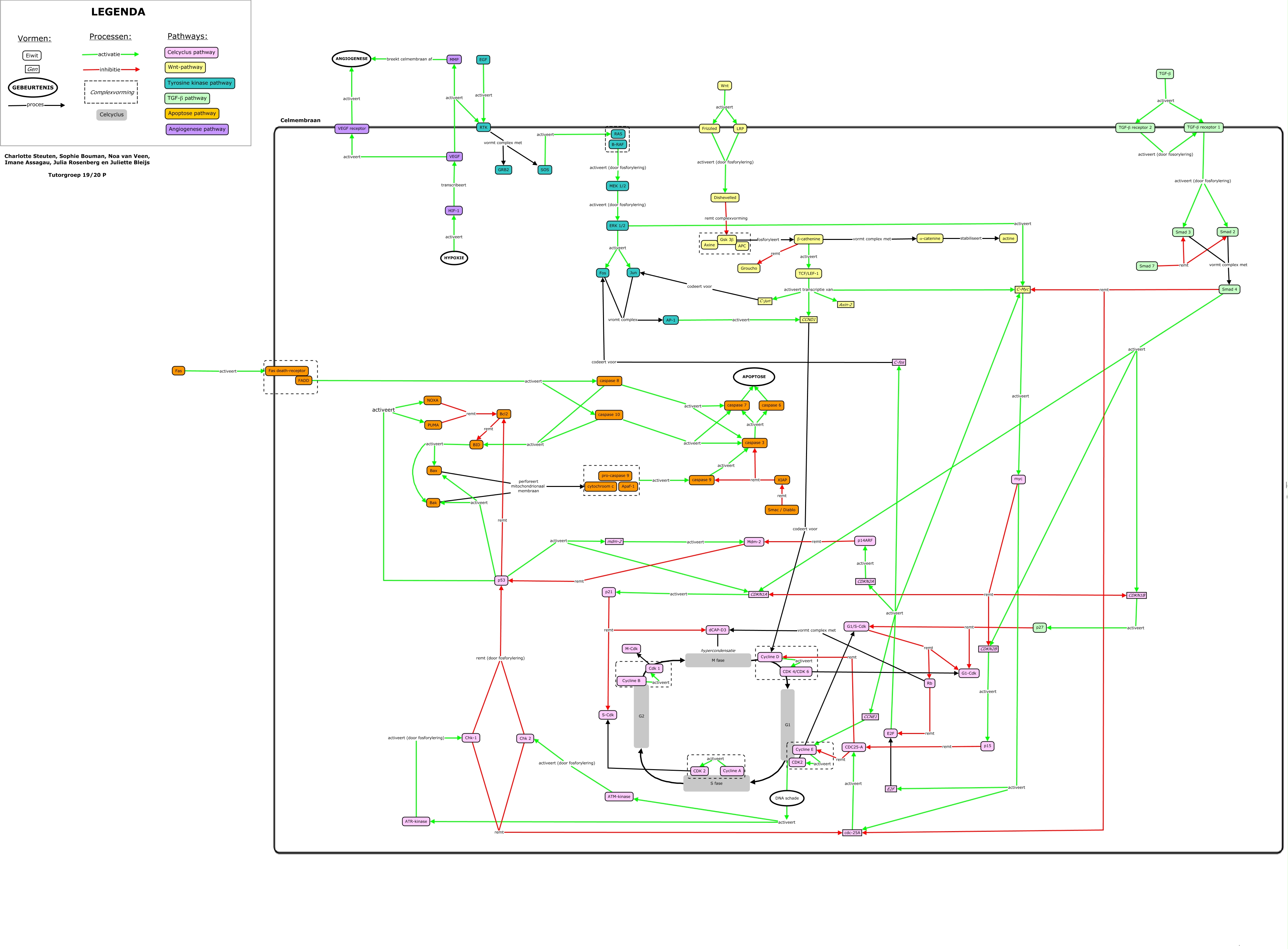 Deze Concept Map heeft informatie gerelateerd aan: Cmap ingeleverd 16-12 19.19, p53 activeert CDKN1A, RTK vormt complex met SOS, myc activeert cdc-25A, TGF-β receptor 2 activeert (door fosorylering) TGF-β receptor 1, E2F activeert CCNE1, β-cathenine vormt complex met α-catenine, p15 remt CDC25-A, Smad 2 vormt complex met Smad 4, CDK 2 S-Cdk, RTK vormt complex met GRB2, ATR-kinase activeert (door fosforylering) Chk-1, activeert caspase 9, Chk 2 remt (door fosforylering) p53, Smad 4 remt C-Myc, Bak perforeert mitochondrionaal membraan cytochroom c, CDK 4/CDK 6 G1-Cdk, Smac / Diablo remt XIAP, ERK 1/2 activeert C-Myc, VEGF activeert RTK, VEGF receptor activeert ANGIOGENESE
