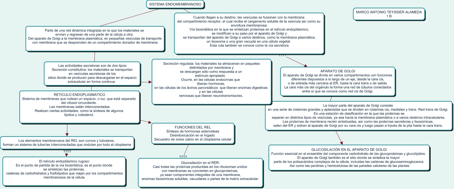 Este Cmap, tiene información relacionada con: SIST ENDO, FUNCIONES DEL REL Síntesis de hormonas esteroideas Desintoxicación en el hígado Secuestro de iones calcio en el citoplasma celular ???? Glucosilación en el RER: Casi todas las proteínas producidas en los ribosomas unidos con membranas se convierten en glucoproteínas, ya sean componentes integrales de una membrana, enzimas lisosómicas solubles, vacuolares o partes de la matriz extracelular., SISTEMA ENDOMEMBRANOSO ???? Parte de una red dinámica integrada en la que los materiales se envían y regresan de una parte de la célula a otra. Del aparato de Golgi a la membrana plasmática, en pequeñas vesículas de transporte con membrana que se desprenden de un compartimiento donador de membrana., Las actividades secretoras son de dos tipos: Secreción constitutiva: los materiales se transportan en vesículas secretoras de los sitios donde se producen para descargarse en el espacio extracelular en forma continua. ???? RETICULO ENDOPLASMATICO Sistema de membranas que rodean un espacio, o luz, que está separado del citosol circundante. Las membranas están interconectadas. Realizan ciertas actividades, como la síntesis de algunos lípidos y colesterol., RETICULO ENDOPLASMATICO Sistema de membranas que rodean un espacio, o luz, que está separado del citosol circundante. Las membranas están interconectadas. Realizan ciertas actividades, como la síntesis de algunos lípidos y colesterol. ???? Los elementos membranosos del REL son curvos y tubulares, forman un sistema de tuberías interconectadas que ondulan por todo el citoplasma, Parte de una red dinámica integrada en la que los materiales se envían y regresan de una parte de la célula a otra. Del aparato de Golgi a la membrana plasmática, en pequeñas vesículas de transporte con membrana que se desprenden de un compartimiento donador de membrana. ???? Las actividades secretoras son de dos tipos: Secreción constitutiva: los materiales se transportan en vesículas secretoras de los sitios donde se producen para descargarse en el espacio extracelular en forma continua., APARATO DE GOLGI El aparato de Golgi se divide en varios compartimientos con funciones diferentes dispuestos a lo largo de un eje, desde la cara cis, o de entrada más cercana al ER, hasta la cara trans o de salida. La cara más cis del orgánulo la forma una red de túbulos conectados entre sí que se conoce como red cis de Golgi. ???? GLUCOSILACIÓN EN EL APARATO DE GOLGI Función esencial en el ensamble del componente carbohidrato de las glucoproteínas y glucolípidos. El aparato de Golgi también es el sitio donde se sintetiza la mayor parte de los polisacáridos complejos de la célula, incluidas las cadenas de glucosaminoglucanos. Así como las pectinas y hemicelulosa de las paredes celulares de las plantas, RETICULO ENDOPLASMATICO Sistema de membranas que rodean un espacio, o luz, que está separado del citosol circundante. Las membranas están interconectadas. Realizan ciertas actividades, como la síntesis de algunos lípidos y colesterol. ???? FUNCIONES DEL REL Síntesis de hormonas esteroideas Desintoxicación en el hígado Secuestro de iones calcio en el citoplasma celular, Cuando llegan a su destino, las vesículas se fusionan con la membrana del compartimiento receptor, el cual recibe el cargamento soluble de la vesícula así como su envoltura membranosa. Vía biosintética en la que se sintetizan proteínas en el retículo endoplásmico, se modifican a su paso por el aparato de Golgi y se transportan del aparato de Golgi a varios destinos, como la membrana plasmática, un lisosoma o una gran vacuola en una célula vegetal. Esta ruta también se conoce como la vía secretora ???? APARATO DE GOLGI El aparato de Golgi se divide en varios compartimientos con funciones diferentes dispuestos a lo largo de un eje, desde la cara cis, o de entrada más cercana al ER, hasta la cara trans o de salida. La cara más cis del orgánulo la forma una red de túbulos conectados entre sí que se conoce como red cis de Golgi., Los elementos membranosos del REL son curvos y tubulares, forman un sistema de tuberías interconectadas que ondulan por todo el citoplasma ???? El retículo endoplásmico rugoso: Es el punto de partida de la vía biosintética; es el punto donde se sintetizan las proteínas, cadenas de carbohidratos y fosfolípidos que viajan por los compartimientos membranosos de la célula., APARATO DE GOLGI El aparato de Golgi se divide en varios compartimientos con funciones diferentes dispuestos a lo largo de un eje, desde la cara cis, o de entrada más cercana al ER, hasta la cara trans o de salida. La cara más cis del orgánulo la forma una red de túbulos conectados entre sí que se conoce como red cis de Golgi. ???? La mayor parte del aparato de Golgi consiste en una serie de cisternas grandes y aplanadas que se dividen en cisternas cis, mediales y trans. Red trans de Golgi. Es una estación de clasificación en la que las proteínas se separan en distintos tipos de vesículas, ya sea hacia la membrana plasmática o a varios destinos intracelulares. Las proteínas de membrana recién sintetizadas, así como las proteínas secretoras y lisosómicas, salen del ER y entran al aparato de Golgi por su cara cis y luego pasan a través de la pila hasta la cara trans., SISTEMA ENDOMEMBRANOSO ???? Cuando llegan a su destino, las vesículas se fusionan con la membrana del compartimiento receptor, el cual recibe el cargamento soluble de la vesícula así como su envoltura membranosa. Vía biosintética en la que se sintetizan proteínas en el retículo endoplásmico, se modifican a su paso por el aparato de Golgi y se transportan del aparato de Golgi a varios destinos, como la membrana plasmática, un lisosoma o una gran vacuola en una célula vegetal. Esta ruta también se conoce como la vía secretora, Las actividades secretoras son de dos tipos: Secreción constitutiva: los materiales se transportan en 