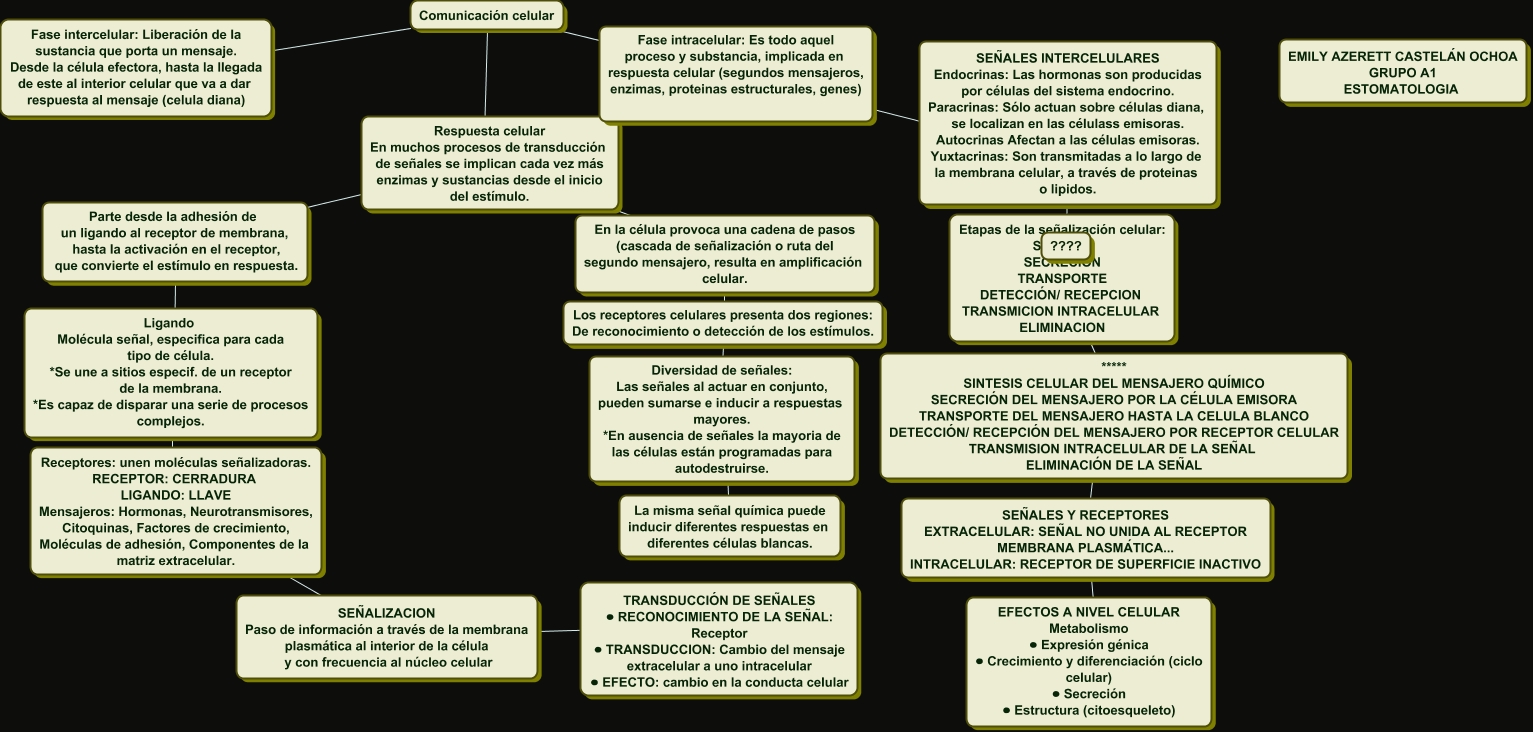 Este Cmap, tiene información relacionada con: COMUNICACIÓN CELULAR, Respuesta celular En muchos procesos de transducción de señales se implican cada vez más enzimas y sustancias desde el inicio del estímulo. ???? En la célula provoca una cadena de pasos (cascada de señalización o ruta del segundo mensajero, resulta en amplificación celular., En la célula provoca una cadena de pasos (cascada de señalización o ruta del segundo mensajero, resulta en amplificación celular. ???? Los receptores celulares presenta dos regiones: De reconocimiento o detección de los estímulos., SEÑALES INTERCELULARES Endocrinas: Las hormonas son producidas por células del sistema endocrino. Paracrinas: Sólo actuan sobre células diana, se localizan en las célulass emisoras. Autocrinas Afectan a las células emisoras. Yuxtacrinas: Son transmitadas a lo largo de la membrana celular, a través de proteinas o lipidos. ???? ????, Comunicación celular ???? Respuesta celular En muchos procesos de transducción de señales se implican cada vez más enzimas y sustancias desde el inicio del estímulo., Comunicación celular ???? Fase intercelular: Liberación de la sustancia que porta un mensaje. Desde la célula efectora, hasta la llegada de este al interior celular que va a dar respuesta al mensaje (celula diana), Etapas de la señalización celular: SINTESIS SECRECIÓN TRANSPORTE DETECCIÓN/ RECEPCION TRANSMICION INTRACELULAR ELIMINACION ???? ***** SINTESIS CELULAR DEL MENSAJERO QUÍMICO SECRECIÓN DEL MENSAJERO POR LA CÉLULA EMISORA TRANSPORTE DEL MENSAJERO HASTA LA CELULA BLANCO DETECCIÓN/ RECEPCIÓN DEL MENSAJERO POR RECEPTOR CELULAR TRANSMISION INTRACELULAR DE LA SEÑAL ELIMINACIÓN DE LA SEÑAL, SEÑALIZACION Paso de información a través de la membrana plasmática al interior de la célula y con frecuencia al núcleo celular ???? TRANSDUCCIÓN DE SEÑALES • RECONOCIMIENTO DE LA SEÑAL: Receptor • TRANSDUCCION: Cambio del mensaje extracelular a uno intracelular • EFECTO: cambio en la conducta celular, SEÑALES Y RECEPTORES EXTRACELULAR: SEÑAL NO UNIDA AL RECEPTOR MEMBRANA PLASMÁTICA... INTRACELULAR: RECEPTOR DE SUPERFICIE INACTIVO ???? EFECTOS A NIVEL CELULAR Metabolismo • Expresión génica • Crecimiento y diferenciación (ciclo celular) • Secreción • Estructura (citoesqueleto), Ligando Molécula señal, especifica para cada tipo de célula. *Se une a sitios especif. de un receptor de la membrana. *Es capaz de disparar una serie de procesos complejos. ???? Receptores: unen moléculas señalizadoras. RECEPTOR: CERRADURA LIGANDO: LLAVE Mensajeros: Hormonas, Neurotransmisores, Citoquinas, Factores de crecimiento, Moléculas de adhesión, Componentes de la matriz extracelular., Fase intracelular: Es todo aquel proceso y substancia, implicada en respuesta celular (segundos mensajeros, enzimas, proteinas estructurales, genes) ???? SEÑALES INTERCELULARES Endocrinas: Las hormonas son producidas por células del sistema endocrino. Paracrinas: Sólo actuan sobre células diana, se localizan en las célulass emisoras. Autocrinas Afectan a las células emisoras. Yuxtacrinas: Son transmitadas a lo largo de la membrana celular, a través de proteinas o lipidos., Los receptores celulares presenta dos regiones: De reconocimiento o detección de los estímulos. ???? Diversidad de señales: Las señales al actuar en conjunto, pueden sumarse e inducir a respuestas mayores. *En ausencia de señales la mayoria de las células están programadas para autodestruirse., Respuesta celular En muchos procesos de transducción de señales se implican cada vez más enzimas y sustancias desde el inicio del estímulo. ???? Parte desde la adhesión de un ligando al receptor de membrana, hasta la activación en el receptor, que convierte el estímulo en respuesta., Receptores: unen moléculas señalizadoras. RECEPTOR: CERRADURA LIGANDO: LLAVE Mensajeros: Hormonas, Neurotransmisores, Citoquinas, Factores de crecimiento, Moléculas de adhesión, Componentes de la matriz extracelular. ???? SEÑALIZACION Paso de información a través de la membrana plasmática al interior de la célula y con frecuencia al núcleo celular, Diversidad de señales: Las señales al actuar en conjunto, pueden sumarse e inducir a respuestas mayores. *En ausencia de señales la mayoria de las células están programadas para autodestruirse. ???? La misma señal química puede inducir diferentes respuestas en diferentes células blancas., ***** SINTESIS CELULAR DEL MENSAJERO QUÍMICO SECRECIÓN DEL MENSAJERO POR LA CÉLULA EMISORA TRANSPORTE DEL MENSAJERO HASTA LA CELULA BLANCO DETECCIÓN/ RECEPCIÓN DEL MENSAJERO POR RECEPTOR CELULAR TRANSMISION INTRACELULAR DE LA SEÑAL ELIMINACIÓN DE LA SEÑAL ???? SEÑALES Y RECEPTORES EXTRACELULAR: SEÑAL NO UNIDA AL RECEPTOR MEMBRANA PLASMÁTICA... INTRACELULAR: RECEPTOR DE SUPERFICIE INACTIVO, Parte desde la adhesión de un ligando al receptor de membrana, hasta la activación en el receptor, que convierte el estímulo en respuesta. ???? Ligando Molécula señal, especifica para cada tipo de célula. *Se une a sitios especif. de un receptor de la membrana. *Es capaz de disparar una serie de procesos complejos., Fase intracelular: Es todo aquel proceso y substancia, implicada en respuesta celular (segundos mensajeros, enzimas, proteinas estructurales, genes) ???? Comunicación celular