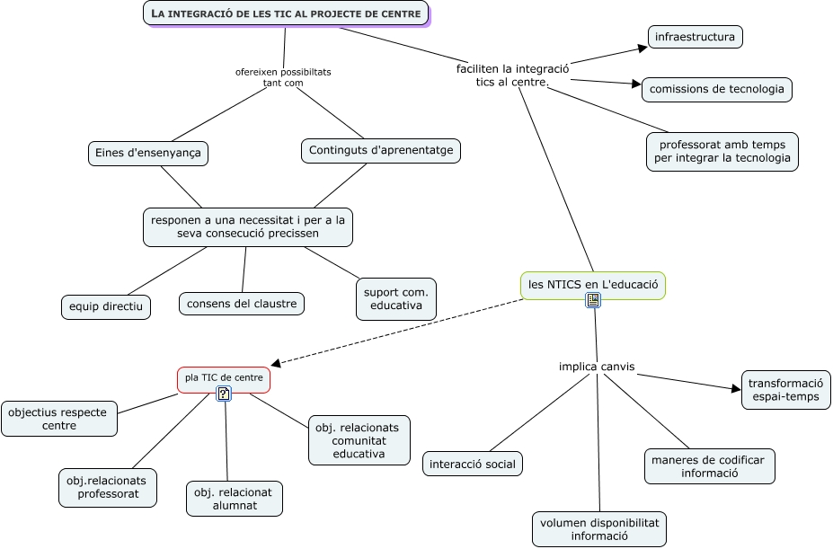 Este Cmap, tiene información relacionada con: bloc 4, les NTICS en L'educació implica canvis transformació espai-temps, LA INTEGRACIÓ DE LES TIC AL PROJECTE DE CENTRE faciliten la integració tics al centre. infraestructura, Continguts d'aprenentatge ???? responen a una necessitat i per a la seva consecució precissen, pla TIC de centre ???? objectius respecte centre, responen a una necessitat i per a la seva consecució precissen ???? equip directiu, responen a una necessitat i per a la seva consecució precissen ???? consens del claustre, pla TIC de centre ???? obj. relacionats comunitat educativa, LA INTEGRACIÓ DE LES TIC AL PROJECTE DE CENTRE ofereixen possibiltats tant com Eines d'ensenyança, LA INTEGRACIÓ DE LES TIC AL PROJECTE DE CENTRE faciliten la integració tics al centre. comissions de tecnologia, les NTICS en L'educació ???? pla TIC de centre, les NTICS en L'educació implica canvis maneres de codificar informació, pla TIC de centre ???? obj. relacionat alumnat, LA INTEGRACIÓ DE LES TIC AL PROJECTE DE CENTRE ofereixen possibiltats tant com Continguts d'aprenentatge, les NTICS en L'educació implica canvis volumen disponibilitat informació, LA INTEGRACIÓ DE LES TIC AL PROJECTE DE CENTRE faciliten la integració tics al centre. professorat amb temps per integrar la tecnologia, Eines d'ensenyança ???? responen a una necessitat i per a la seva consecució precissen, LA INTEGRACIÓ DE LES TIC AL PROJECTE DE CENTRE faciliten la integració tics al centre. les NTICS en L'educació, pla TIC de centre ???? obj.relacionats professorat, responen a una necessitat i per a la seva consecució precissen ???? suport com. educativa, les NTICS en L'educació implica canvis interacció social
