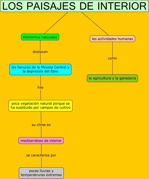 Este Cmap, tiene información relacionada con: Los paisajes de interior, LOS PAISAJES DE INTERIOR las actividades humanas, las llanuras de la Meseta Central y la depresión del Ebro hay poca vegetación natural porque se ha sustituido por campos de cultivo, poca vegetación natural porque se ha sustituido por campos de cultivo su clima es meditarráneo de interior, meditarráneo de interior se caracteriza por pocas lluvias y temperatruras extremas, elementos naturales destacan las llanuras de la Meseta Central y la depresión del Ebro, LOS PAISAJES DE INTERIOR elementos naturales, las actividades humanas como la agricultura y la ganadería