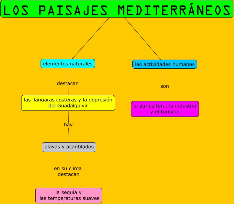 Este Cmap, tiene información relacionada con: Los paisajes mediterráneos, las llanuaras costeras y la depresión del Guadalquivir hay playas y acantilados, elementos naturales destacan las llanuaras costeras y la depresión del Guadalquivir, las actividades humanas son la agricultura, la industria y el turismo, LOS PAISAJES MEDITERRÁNEOS elementos naturales, playas y acantilados en su clima destacan la sequía y las temperaturas suaves, LOS PAISAJES MEDITERRÁNEOS las actividades humanas