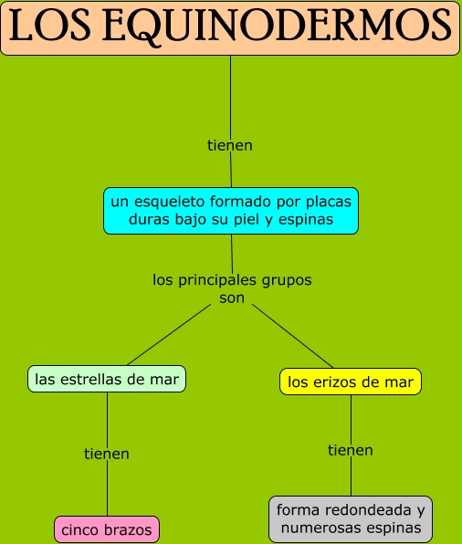 Este Cmap, tiene información relacionada con: Los equinodermos, un esqueleto formado por placas duras bajo su piel y espinas los principales grupos son las estrellas de mar, un esqueleto formado por placas duras bajo su piel y espinas los principales grupos son los erizos de mar, las estrellas de mar tienen cinco brazos, LOS EQUINODERMOS tienen un esqueleto formado por placas duras bajo su piel y espinas, los erizos de mar tienen forma redondeada y numerosas espinas