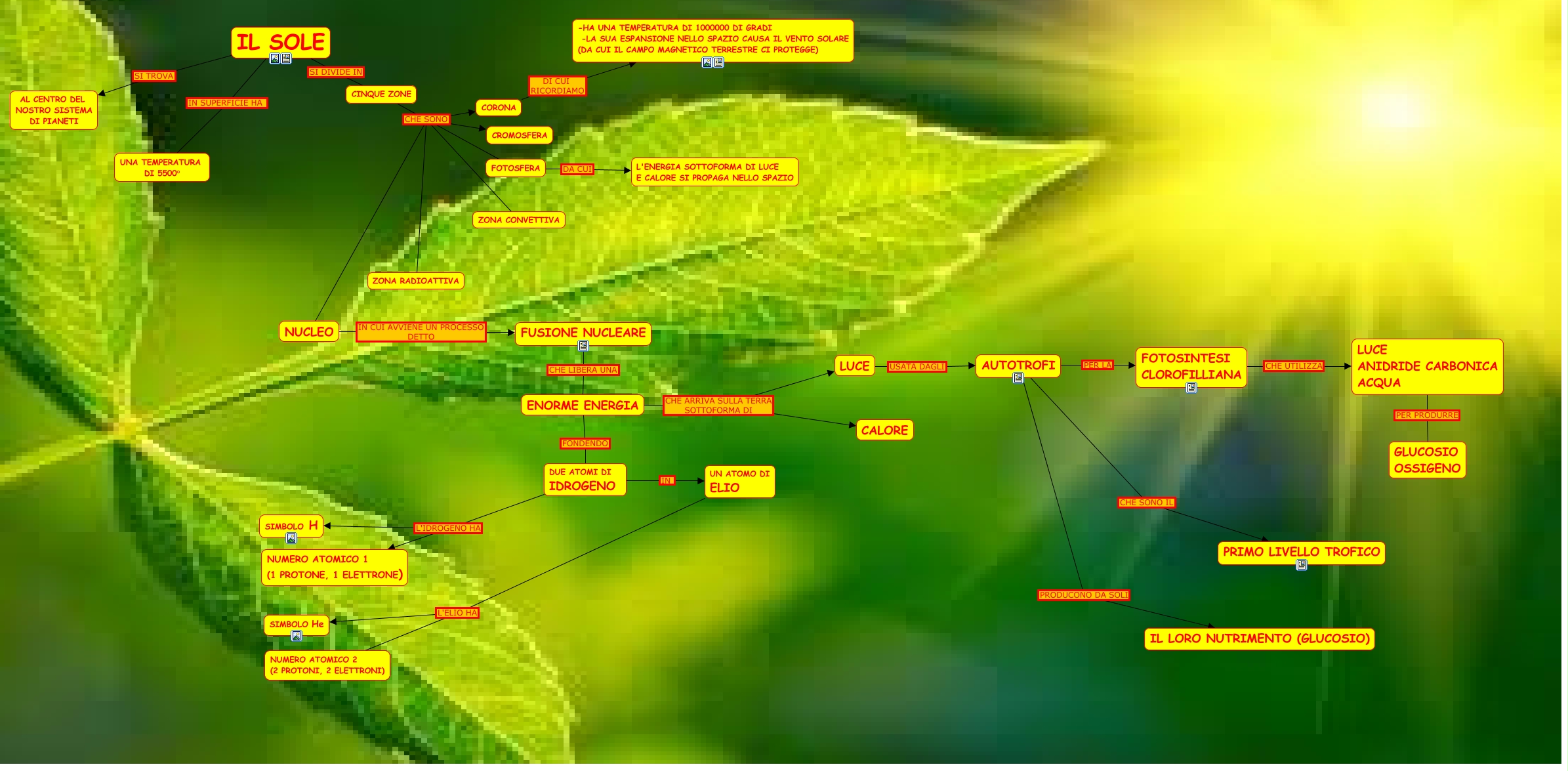 Questa Cmap, creata con IHMC CmapTools, contiene informazioni relative a: SOLE FOTOSINTESI FUSIONE, CORONA DI CUI RICORDIAMO -HA UNA TEMPERATURA DI 1000000 DI GRADI -LA SUA ESPANSIONE NELLO SPAZIO CAUSA IL VENTO SOLARE (DA CUI IL CAMPO MAGNETICO TERRESTRE CI PROTEGGE), CINQUE ZONE CHE SONO ZONA CONVETTIVA, CINQUE ZONE CHE SONO NUCLEO, FUSIONE NUCLEARE CHE LIBERA UNA ENORME ENERGIA, LUCE ANIDRIDE CARBONICA ACQUA PER PRODURRE GLUCOSIO OSSIGENO, IL SOLE SI TROVA AL CENTRO DEL NOSTRO SISTEMA DI PIANETI, ENORME ENERGIA CHE ARRIVA SULLA TERRA SOTTOFORMA DI LUCE, ENORME ENERGIA FONDENDO DUE ATOMI DI IDROGENO, CINQUE ZONE CHE SONO ZONA RADIOATTIVA, AUTOTROFI PER LA FOTOSINTESI CLOROFILLIANA, FOTOSFERA DA CUI L'ENERGIA SOTTOFORMA DI LUCE E CALORE SI PROPAGA NELLO SPAZIO, DUE ATOMI DI IDROGENO L'IDROGENO HA SIMBOLO H, IL SOLE IN SUPERFICIE HA UNA TEMPERATURA DI 5500°, CINQUE ZONE CHE SONO FOTOSFERA, AUTOTROFI PRODUCONO DA SOLI IL LORO NUTRIMENTO (GLUCOSIO), DUE ATOMI DI IDROGENO L'IDROGENO HA NUMERO ATOMICO 1 (1 PROTONE, 1 ELETTRONE), FOTOSINTESI CLOROFILLIANA CHE UTILIZZA LUCE ANIDRIDE CARBONICA ACQUA, UN ATOMO DI ELIO L'ELIO HA NUMERO ATOMICO 2 (2 PROTONI, 2 ELETTRONI), CINQUE ZONE CHE SONO CORONA, AUTOTROFI CHE SONO IL PRIMO LIVELLO TROFICO